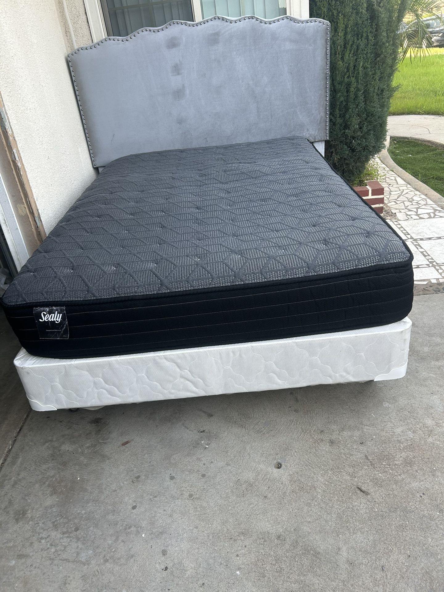 CAMA FULL SZ CABECERA TAPIZADA COLO GRIS MARCO DE METAL BOX SPRING Y COLCHÓN SEALY USADA BUENA CONDICIÓN