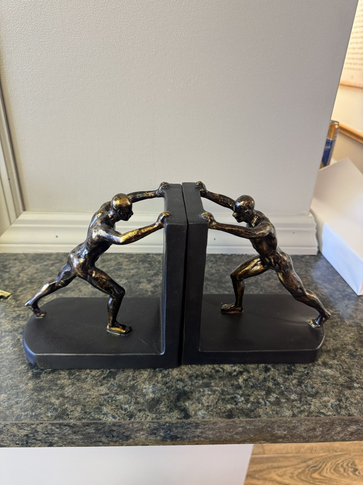 Unique and eye-catching set of two bronze-tone bookends, each featuring a stylized human figure in a dynamic pushing pose. Perfect for office shelves, home libraries, or modern décor setups. ✨ Features: • Heavy, stable resin with metallic bronze finish • Artistic “Pushing Figures” design — symbolic of strength and balance • Felt bottoms to protect surfaces • Excellent condition with only minor wear on the base Dimensions (each): approx. 7” H × 6” W × 3” D 💸 $45 OBO 📍 Pickup in New Castle, PA Adds personality and sophistication — a great accent piece for desks, shelves, or office displays.