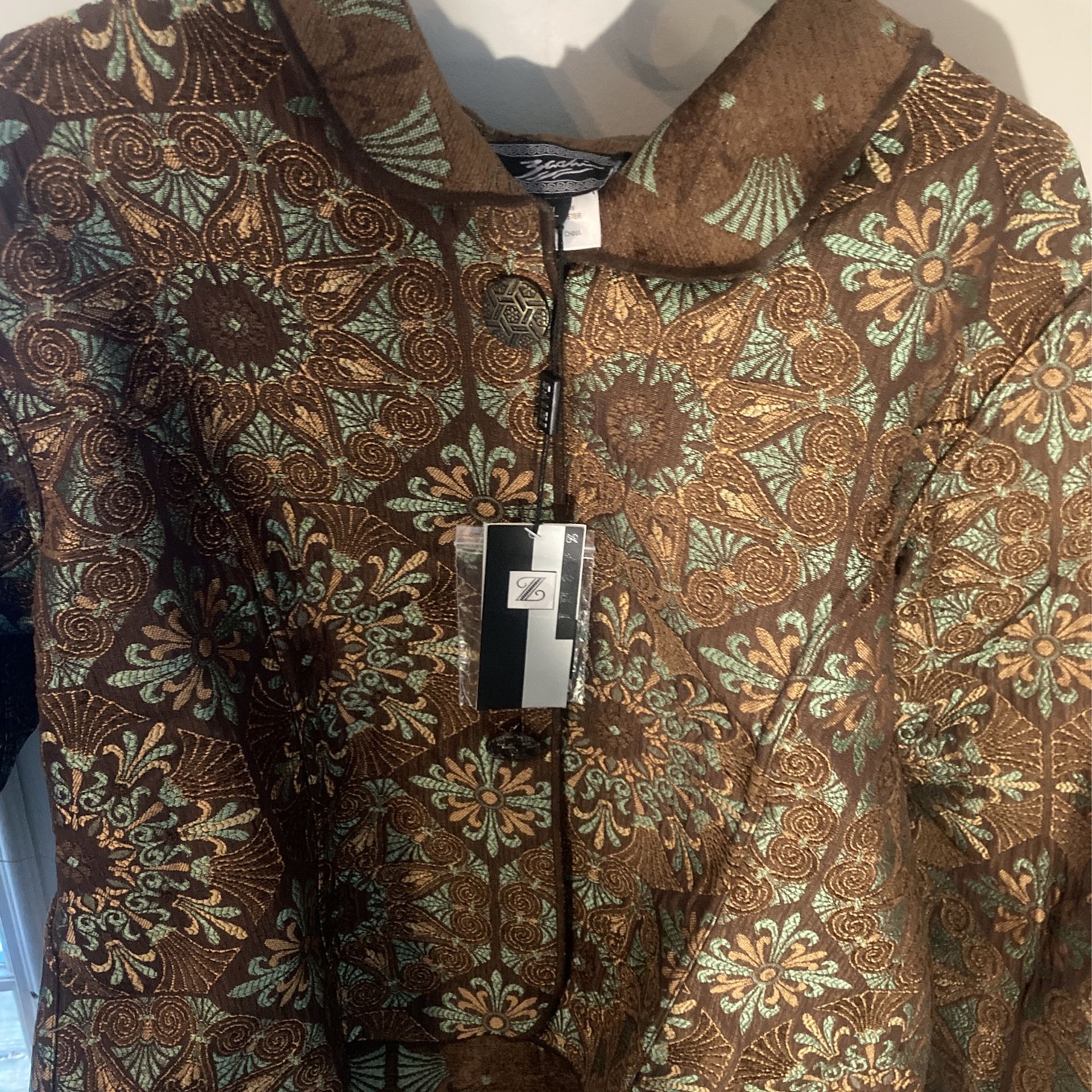 A really nice contemporary Dede/ brown tourquoise & tandesugnslightly quilted has a collar &large faux antique buttons hip length versatile canbe casual or dressier depending on how u accessorize full long arms