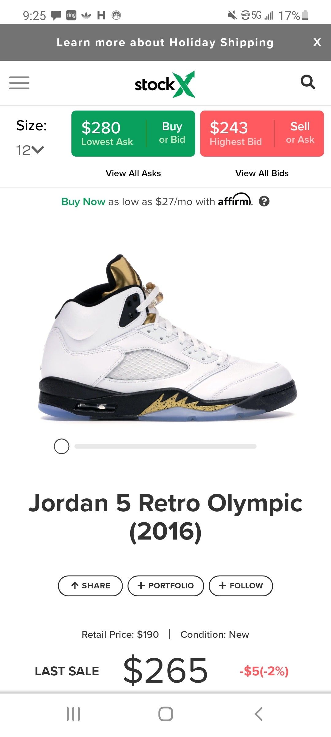 Jordan 5 Olympic size 12