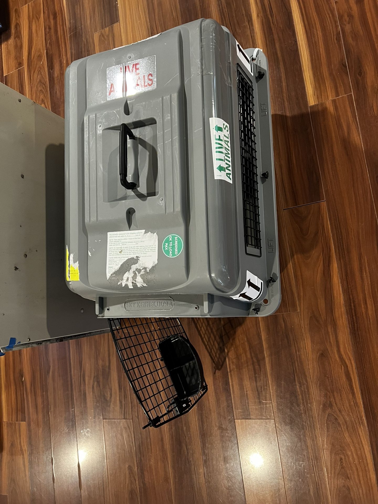 Comes with food and water tray, used for airplane travel. 21 height 26 deep 16 width for 25 to 30lb dogs