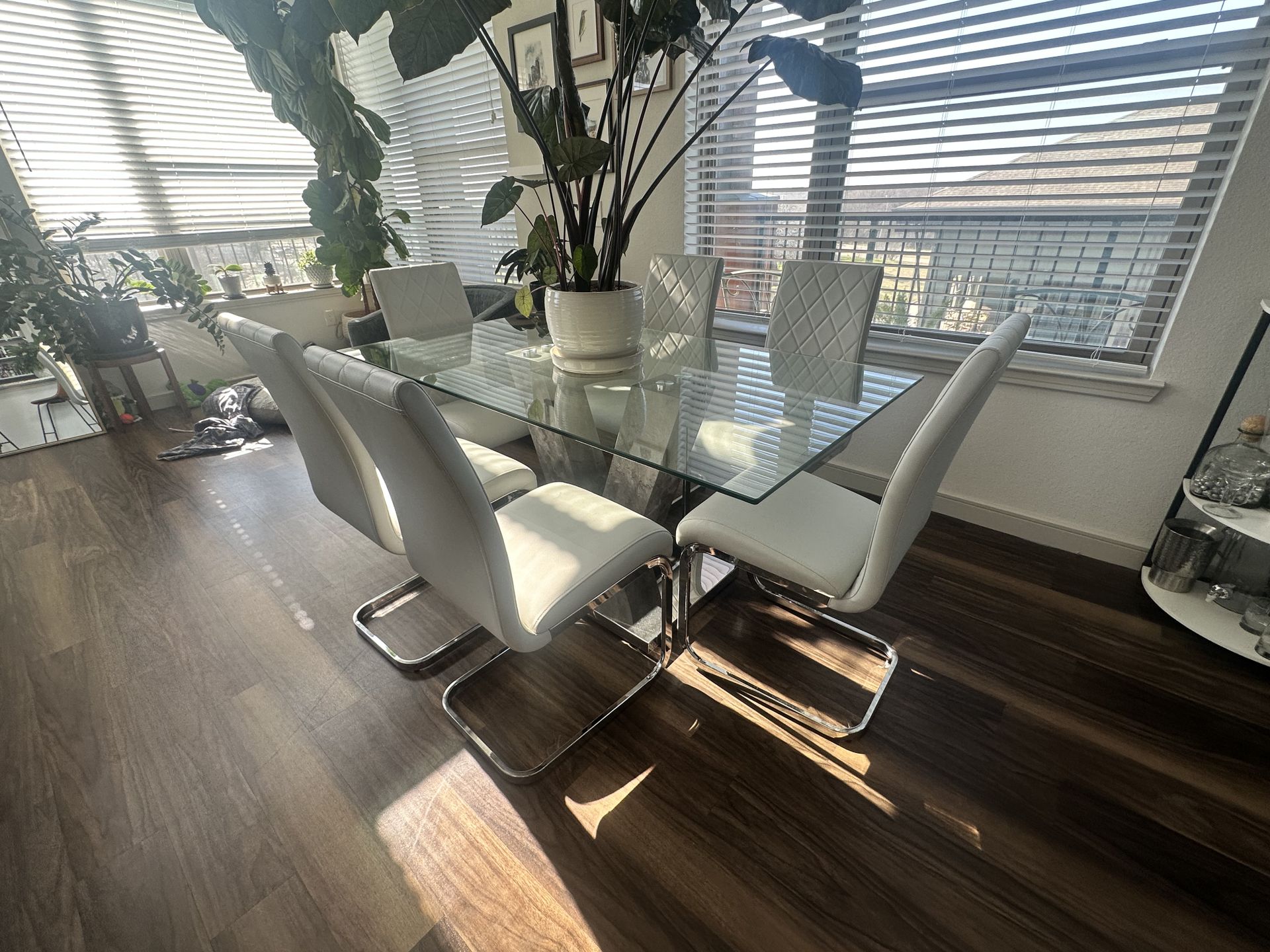 Moving and selling dining table set. Set is from Cramco Inc. Glass top (63” x 36”) Chairs are a faux leather, light grey color. (6 total, side chairs) Table set in great condition. No delivery, must pick up.