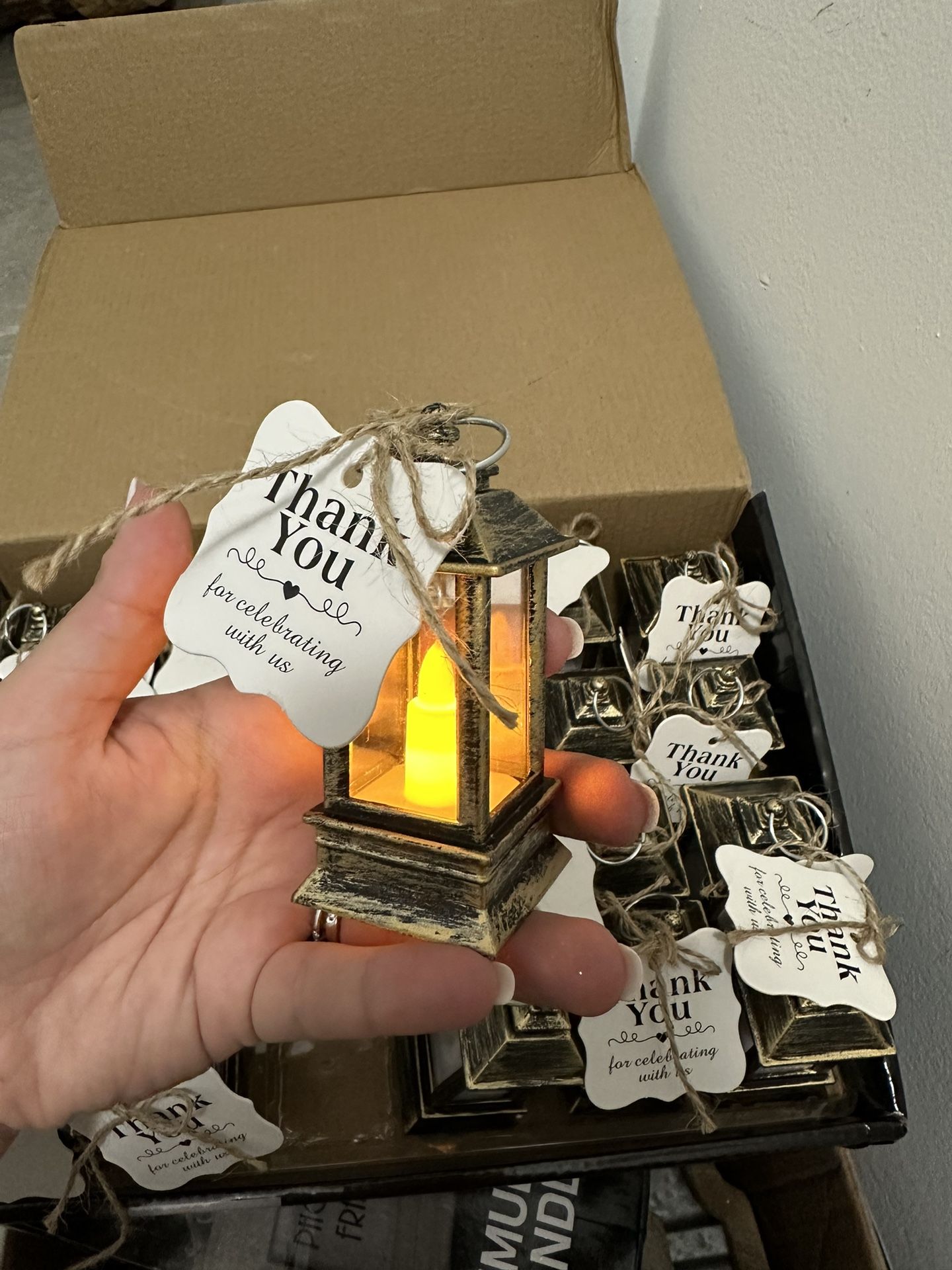 30 Mini favor lanterns. Bought 24 for $30 on Amazon. Added the thank you card to it.