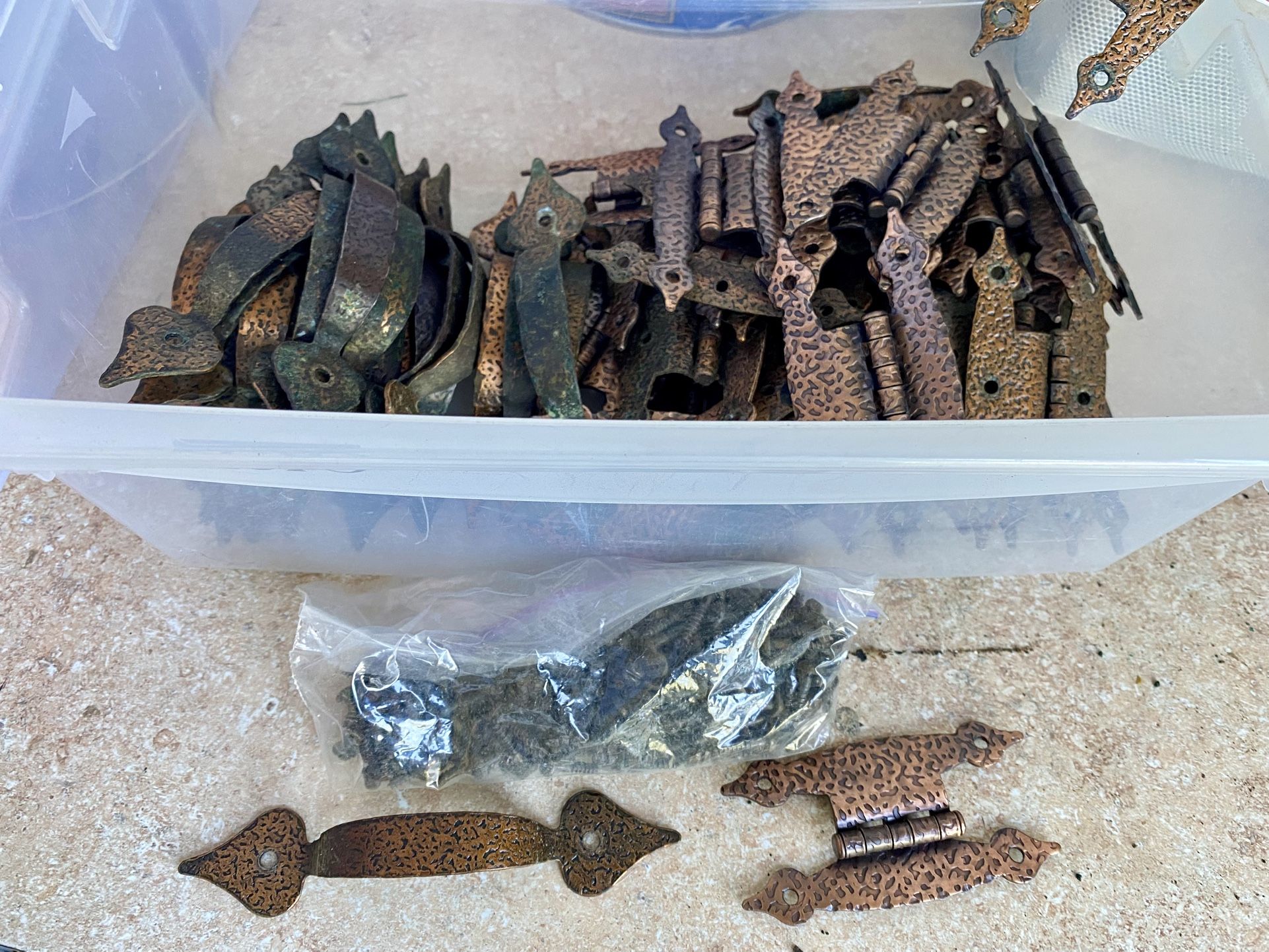 25 handles 42 hinges hammered copper with screws in vintage used condition. $40 for all. A used lot on eBay recently sold for $85. with 23 handles and only 26 hinges with no screws. FCFS cash or Venmo only. Pick up in East Murrieta 92563