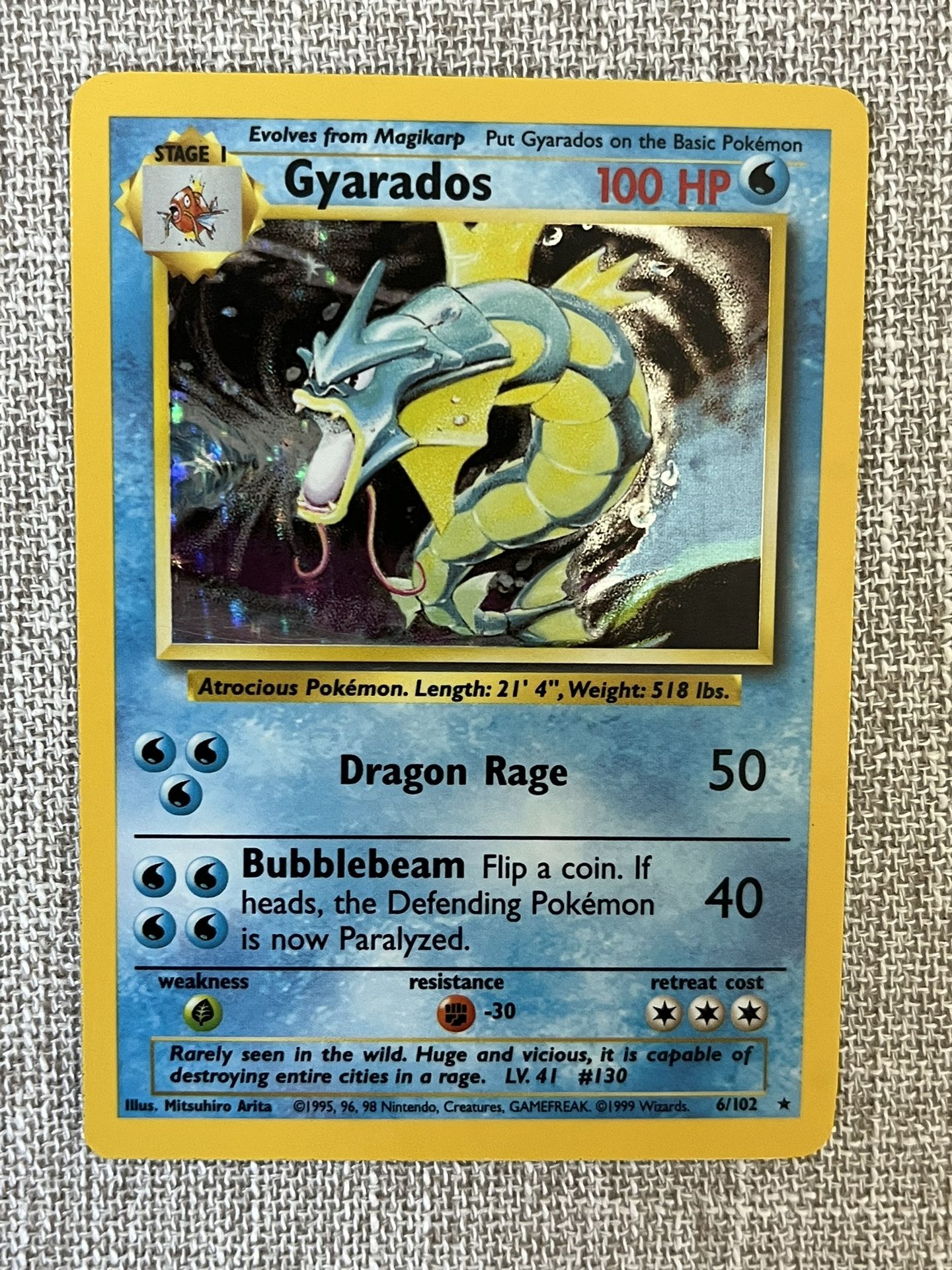 Vintage Rare holographic Pokemon card in phenomenal condition!!!! Gyarados from the original series base set! Gyarados #6/102 I also accept Venmo and PayPal and will ship for free in a plain white envelope if you pay that way, the choice is yours if you want to trust me and save a few $$. My reviews will speak for themselves!! See my other listings for bundle options to save on shipping, I will happily put multiple single cards together into any order you want!! Follow my commerce profile for many more items in the future!!! Features: -great condition -preserved in sleeve and top loader -never played -ships extremely secure via USPS first class mail inside of padded envelope!!