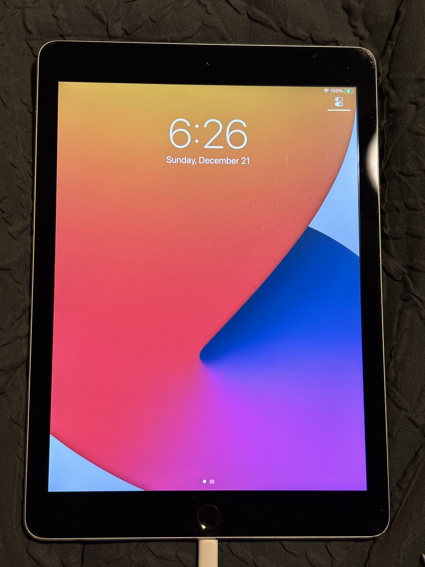 Used iPad Air 2 64gb WiFi only with case. Minor scratches on front and back not noticeable when using. Uses lightning cable (not included)