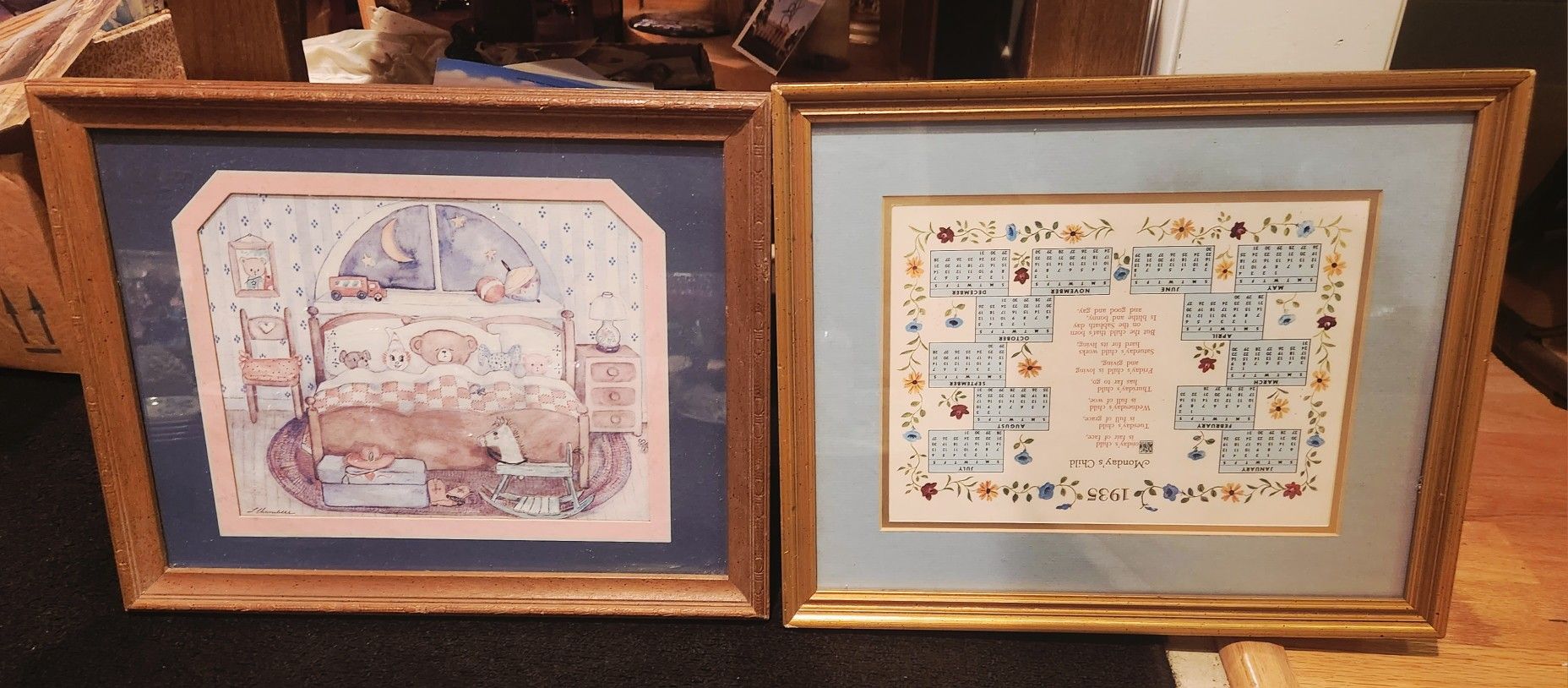 1) is a children's bedroom scene by L Chambers. 12.5 x 15.25 inches 2) is a framed and Matted calender from 1935 with a poem Titled Monday's Child. Actually is a very nice piece. 12.75 x 15.25 inches. Selling both for 20 bucks. Great deal. Pick up in James Island near folly.