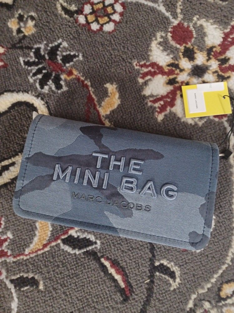 Marc Jacobs The Mini Bag Camo Jacquard Shoulder Bag Brand new Color:BLUE CAMO Size info 7 1/2"W x 4 1/2"H x 1 1/2"D. (Interior capacity: extra-small.) 23" crossbody strap. Details & care Logo labeling adds a distinguished touch to a compact shoulder bag in a classic camo pattern. Magnetic closure Removable shoulder strap Interior wall pocket; eight card slots Lined Textile Imported $90 Final price