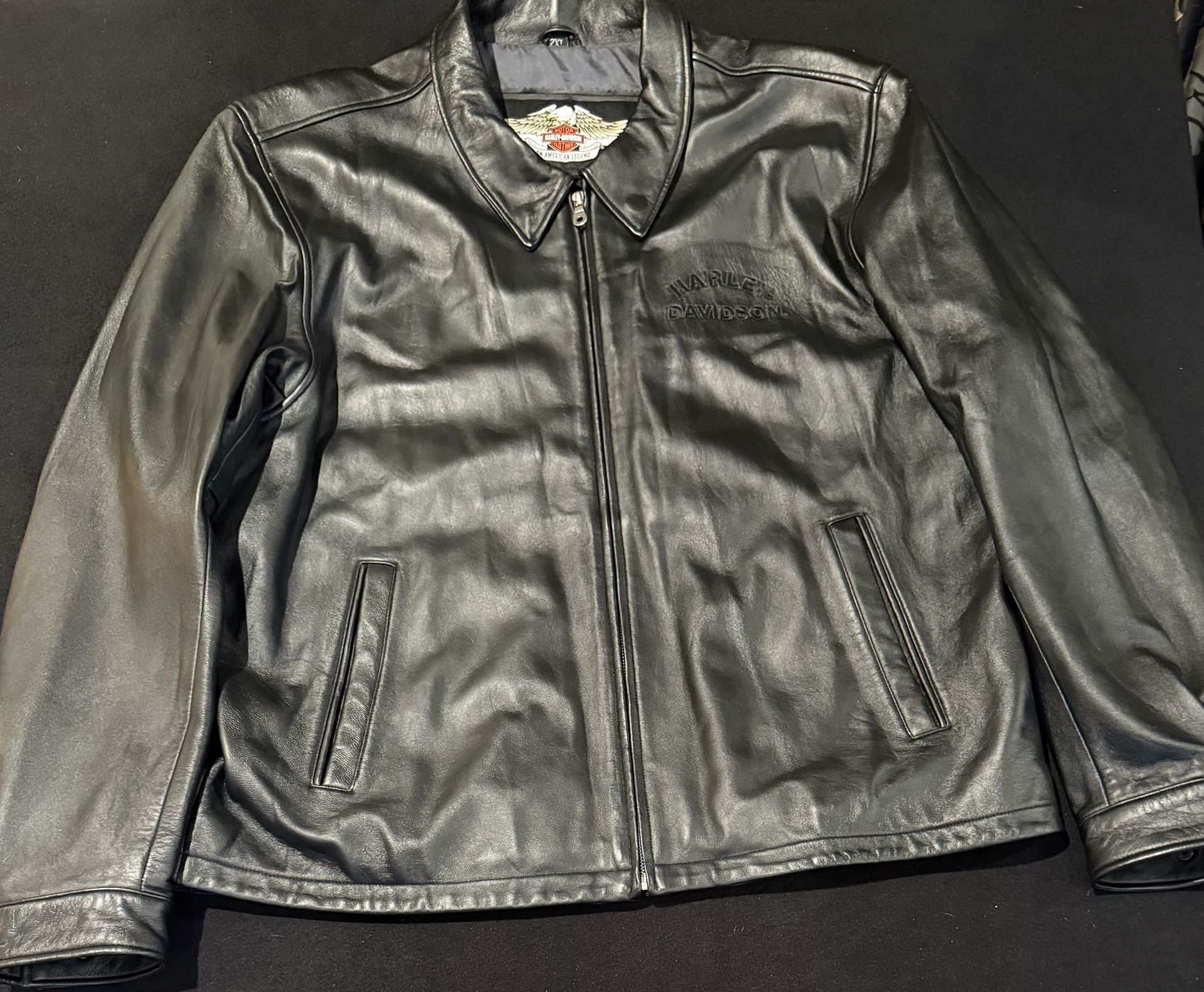 The price is Firm. The Harley-Davidson Embossed Black Leather Jacket is a vintage piece for men in size 2XL. Made by the iconic American motorcycle brand, this jacket is a classic and collectible item that exudes style and heritage. With its embossed Harley-Davidson logo, this leather jacket is a must-have for Harley enthusiasts looking to add a touch of Americana to their wardrobe. Perfect for casual wear or motorcycle rides, this jacket is a timeless piece that captures the spirit of the brand. Seller notes one fabric imperfection on the right shoulder seam. The jacket is original and has not been touched up.