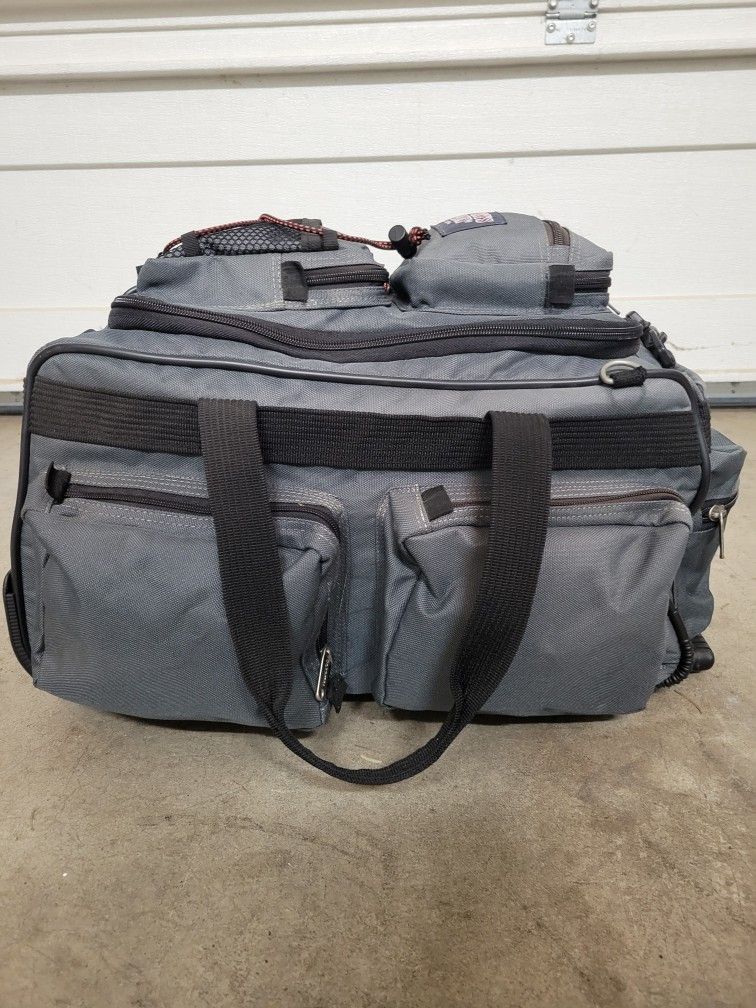 Gray canvas 7 zippered pockets. Carrying handle, shoulder strap. Collapsible handle Size L 22" x W 12"x D 11" inside depth 10"
