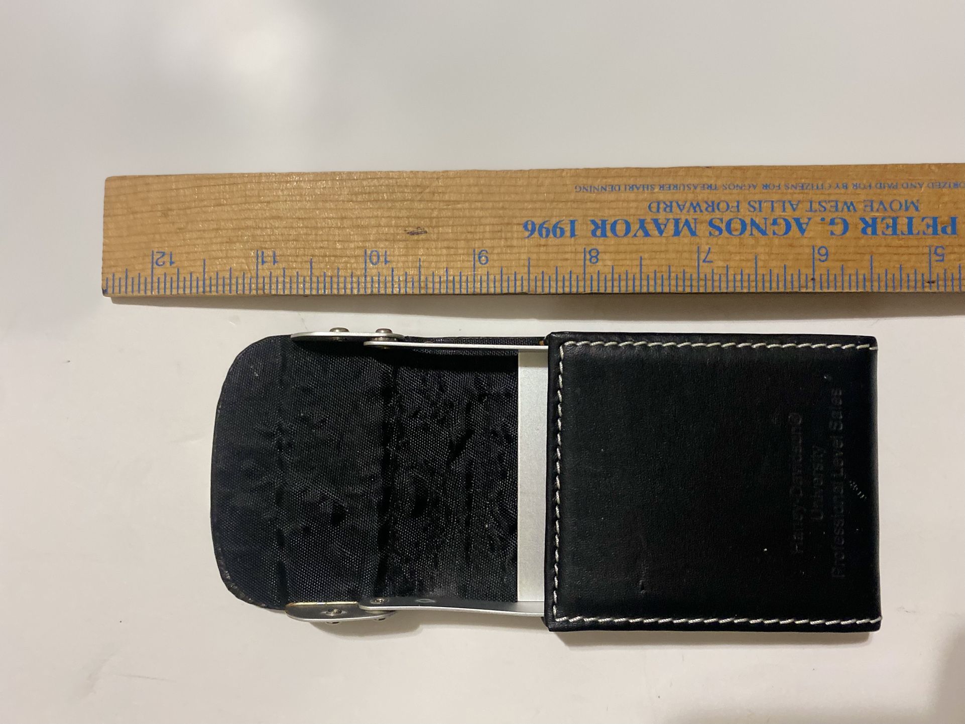 Slides open. Mechanically works fine . Has 2 small white scuffs on it. It’s very cool, the inside is like black felt.