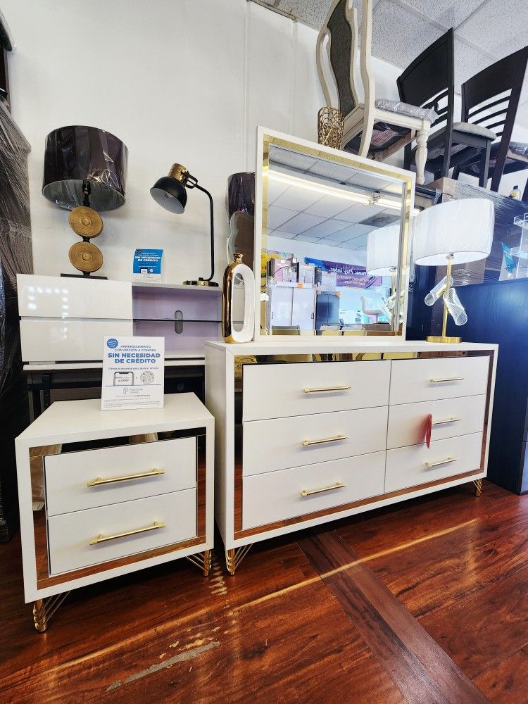 Bedroom set 3 Pc Dresser , Mirror and Nightstand, White finish, Glossy Gold Mirror trim accent. Gold metal finish hardware and legs. Solid quisiera, Engineered wood, others. Kenlin center glides drawers. Nighstand 22"x17.25"x24.25"h. Dresser 59"x17.25"x34"h. Mirror 40"x1"x40"h. New in box ! Ready to Deliver the next Day! We offer Delivery and Assembly service for an extra cost, Ask for price ! Cheap Deliver , ask for price ! Check my list to find the Furniture of your Dreams !🤑💲💰🔥 Financing available Snap, Progressive and Acima ! Text 82685 to 48078 to apply now for Snap! Text 90129 to 22462 to apply now for Acima ! Text Brothers to 57597 to apply now for Progressive ! Address : 1212 S Bristol St Santa Ana Ca 92704. #7 10:00am to 7:00pm Hablamos Español !
