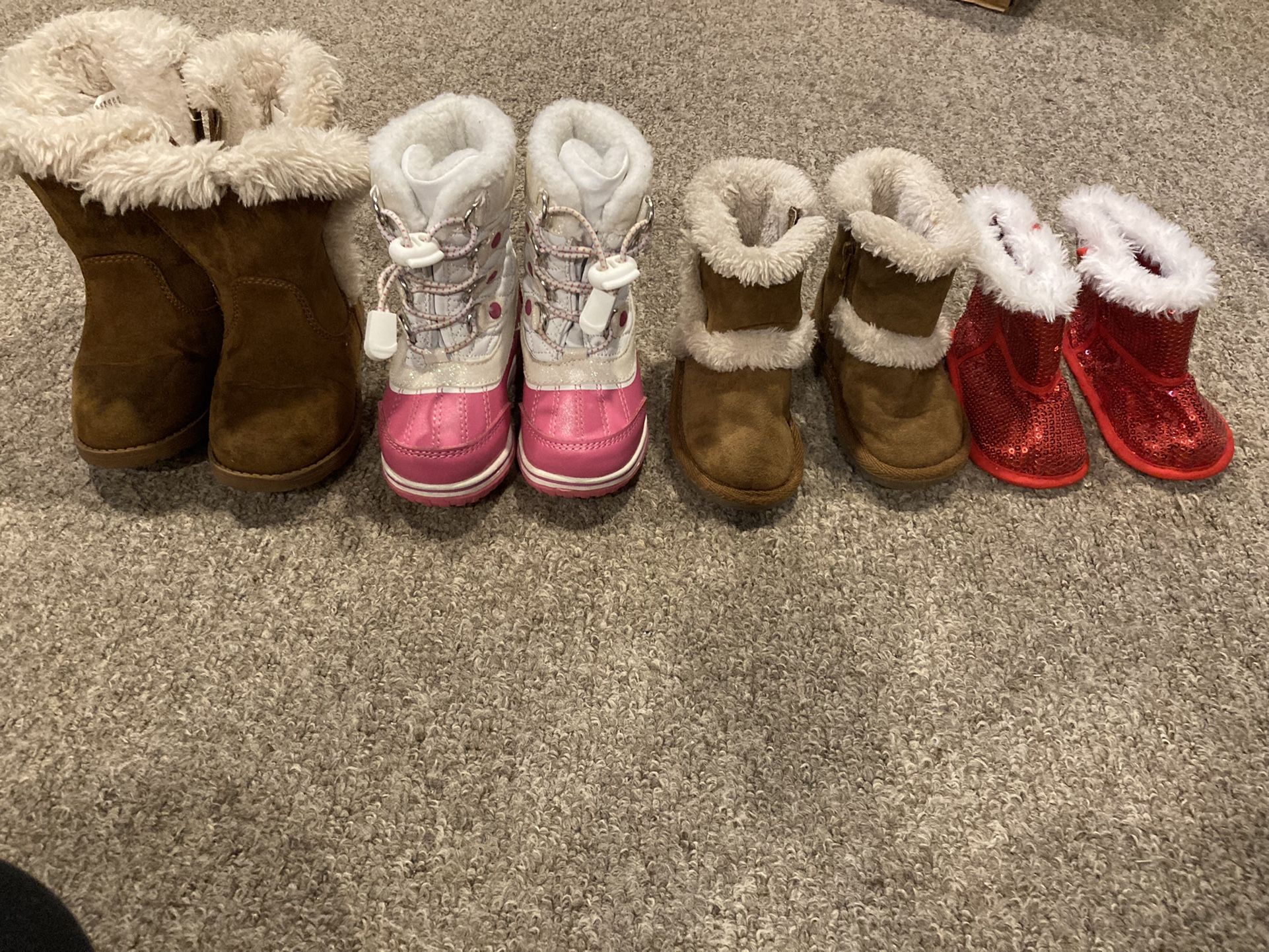 Have four pairs of girls boots 3 are fashion boots one is a winter boot which basically is like brand new . Brown Cat& Jack boots size 8-$5 Totes winter boot size 5-$10 Brown teeny toes boots-$3 Red sequin boot size 9-12mon-$1 May negotiate. Cash buyers pickup in northwest Columbus.