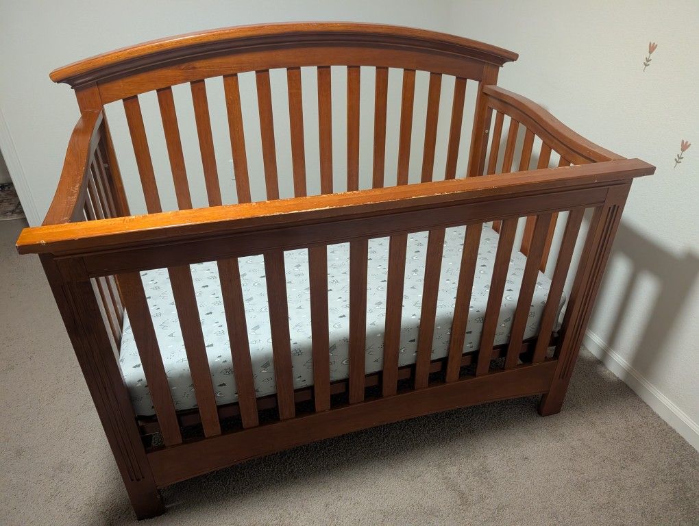 Essentials BLISS CURVED TOP CRIB 2712. Used a few scratches on top. Mattress included.