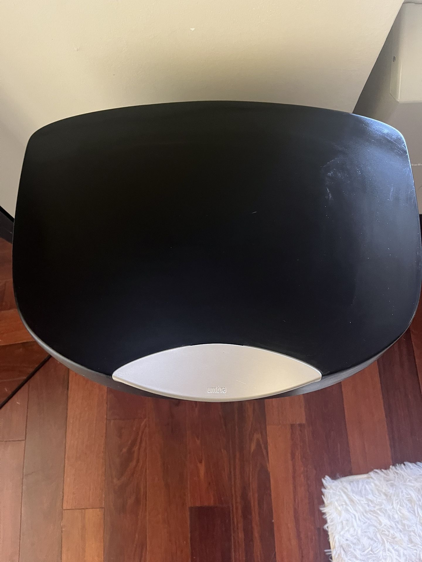 Great condition. Works great. Lightweight. Stepping trash can. Cleaned with disinfectant products. It is medium size 13 gallon trash can. Has the sticky stuff on front from the sticker.