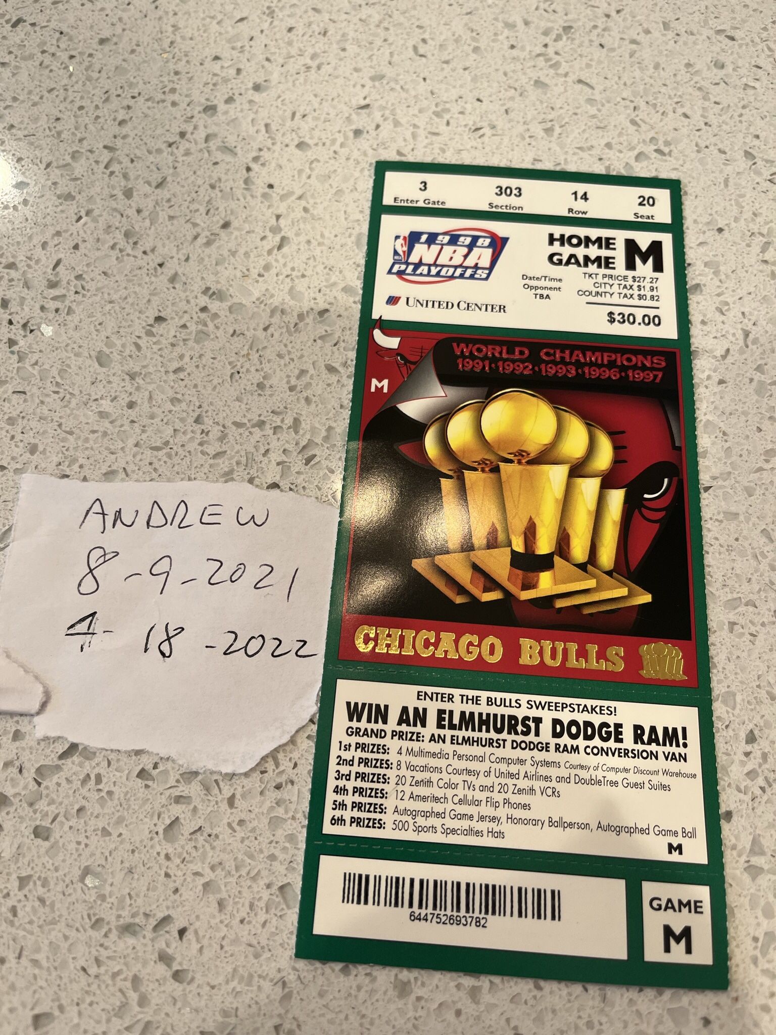 Full ticket ( not separated) from Michael Jordan’s last game in Chicago. The ticket is in mint condition. The first ticket of the 2 has been sold. The ticket for sale is the one listed with the name Andrew. The price is firm.