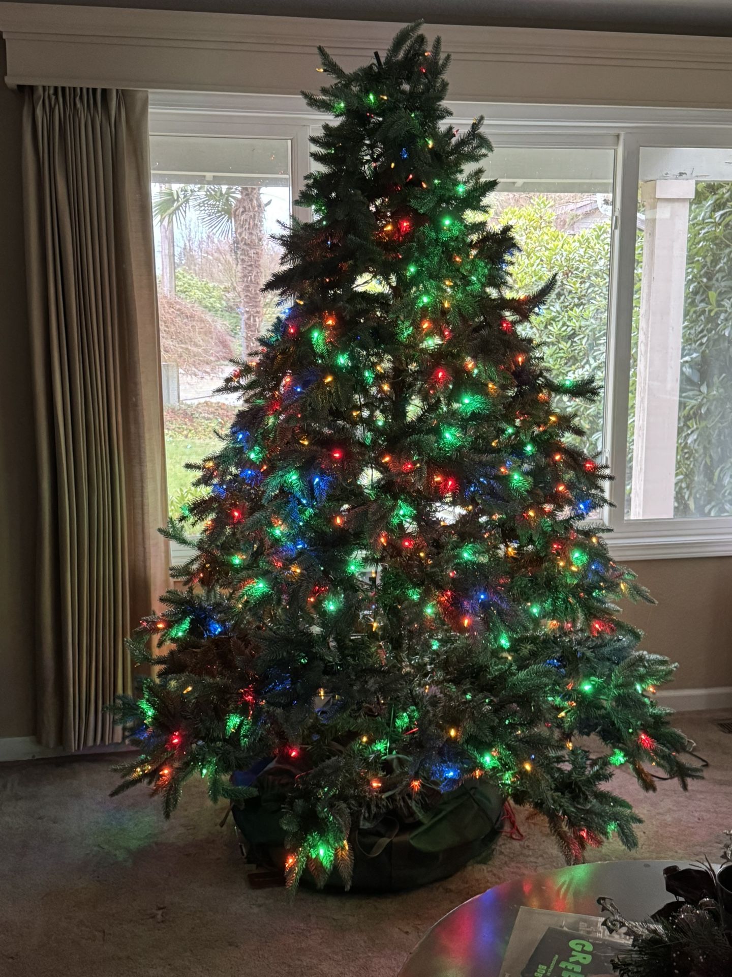 Balsam Hill Christmas tree. Includes stand and case. It’s a wide tree. 7 1/2’ tall. Prelit with multicolored lights. A few lights are burned out but it’s not noticeable. The lights are nice and bright.