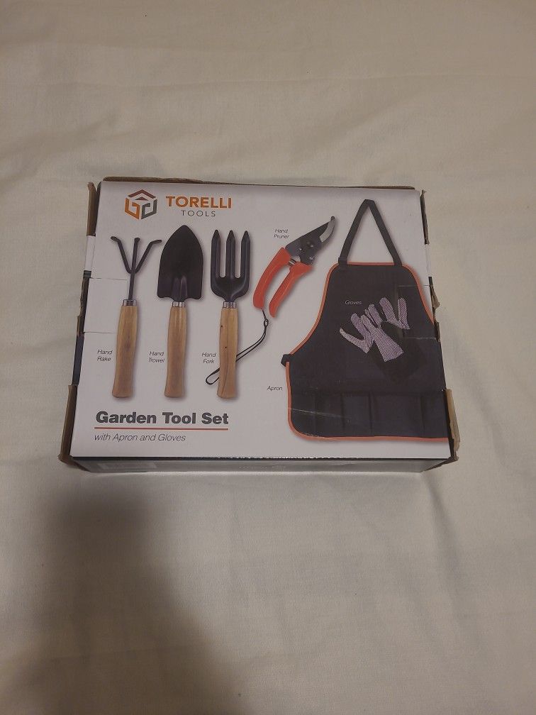 Brand new in box. Garden tool set with apron and gloves. Hand rake, hand trowel, hand fork, hand pruner, apron.