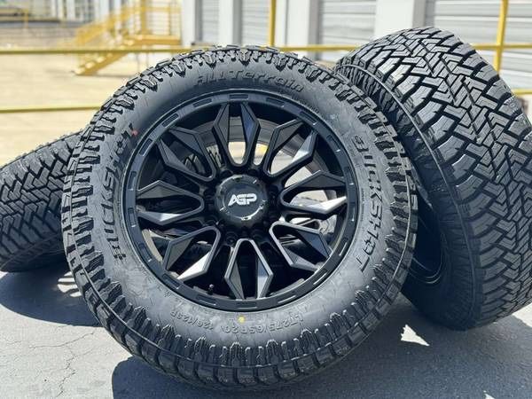 Set of 4 new Heavy Duty 20" Wheels with LT275/65r20 Buckshot A/T tires 20x9 8x180 +0mm offset Will fit 2011-2024 GMC Sierra 2500 3500 HD Chevy 2500 3500HD $1200 rims only $1950 rims and tires $200 sensors Free balance Dealer storage. We can only deliver. Free delivery