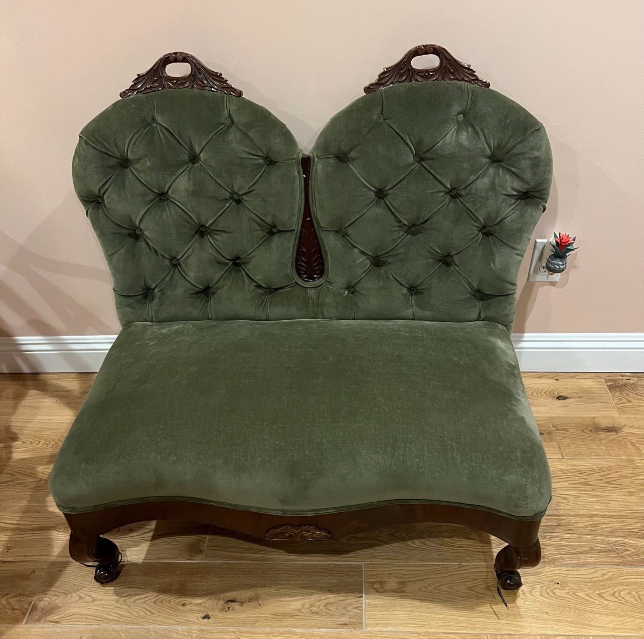 Antique Victorian Carved Walnut & Green Velvet Couch Love Seat- Art Deco Mid Century Arts And Crafts Style