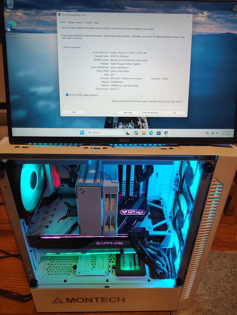 Selling my old gaming rig. Everything works perfectly, ran all of my games just fine, however I am getting into PCVR and needed an upgrade Specs 512gb HDD 512gb adata sata SSD 3600x processor with deep cool heatsink 6 Deep cool and Montech 120mm fans Sapphire nitro 5700xt GPU 16gb Corsair ram 850w antec semi modular PSU Brand new Windows 11 pro installation with Key Pcie wifi adapter Comes with power cord and HDMI cable Screen not included