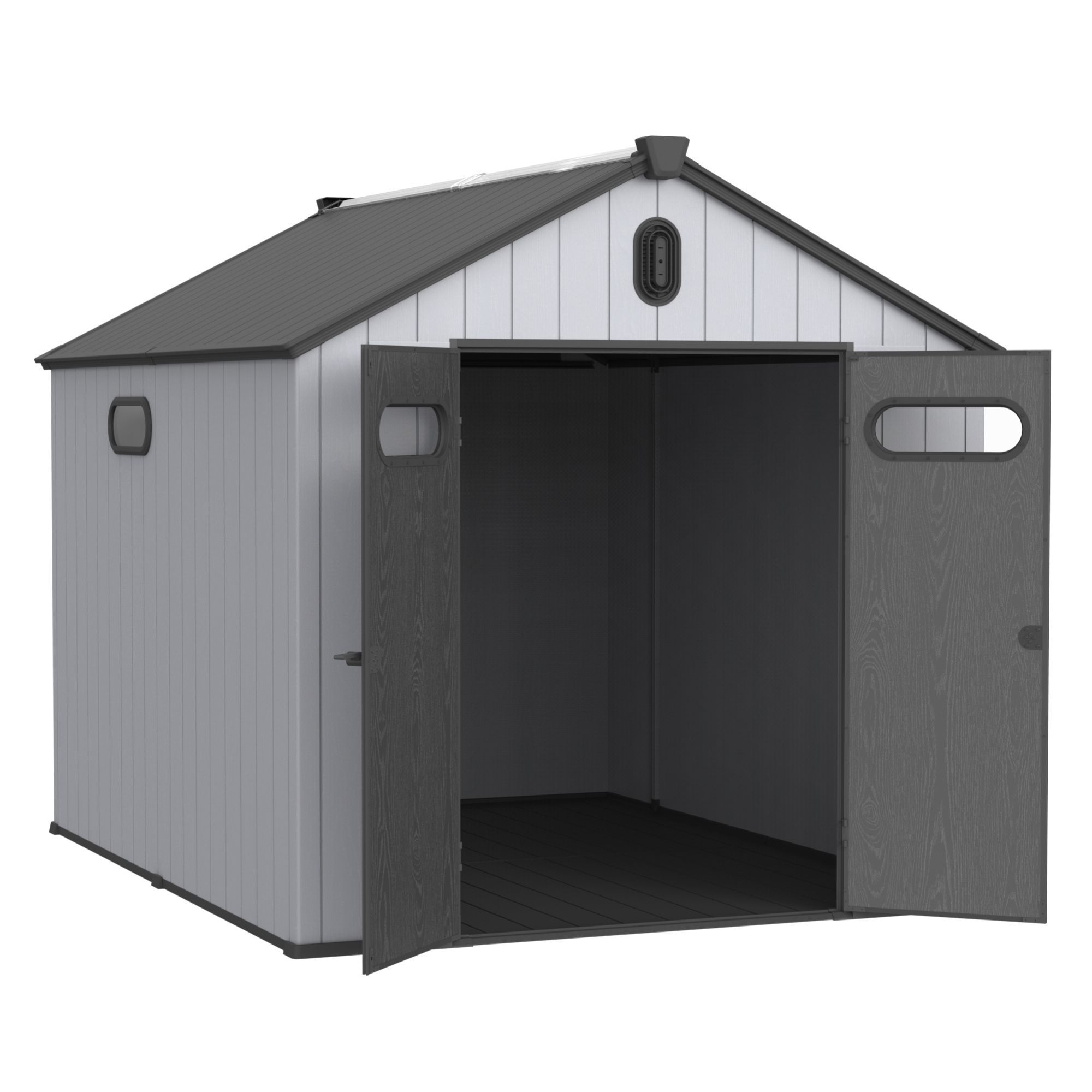 8*10ft resin plastic storage shed for backyard garden big spire Tool storage Sub-item 1: W1711P225244 59.05 * 26.38 * 12.6 in. 120.15 lbs. Sub-item 2: W1711P225234 72.2 * 27 * 11.8 in. 119.71 lbs. Sub-item 3: W1711P225233 78.74 * 28.34 * 8.07 in. 111.55 lbs. 50% MORE WALL STRENGTH FOR DURABILITY: Double wall construction and robust, wall-connector pins prevent warping caused by weather or weight 180 DEGREE DOOR OPENING: Doors open a full 180 degrees for convenient access to large items Outdoor storage shed units made to store large lawn care essentials, including riding and push mowers, patio, and garden equipment, and large trash cans. Integrated rain gutter helps with water management providing protection through all seasons. W1711S00011