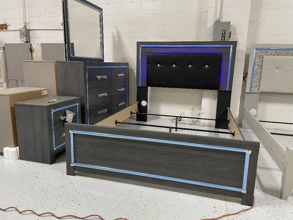 New LED Queen Bed frame with dresser and mirror and 1 nightstand with wireless charger π we can deliver π