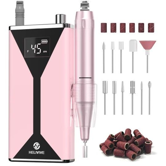 Brand New in Box, Factory Sealed, Never Opened Never Used! Retail - 39.99 (+tax) đ Get it here for 20 today! đ Professional Electric Nail Drill 45000RPM (Portable & Rechargeable) (with 11 Drill Bits ) Cordless Nail File Machine for Shaping, Polishing & Removing Gel Nails for Salon Home (Pink) ăProfessional-Grade 45,000RPM Nail Drillă This electric nail drill features a powerful upgraded aluminum alloy motor and a unique ventilation system bearing, boosting polishing efficiency by 200%. Ensuring smooth and stable operations, it enhances durability, with low vibration, low heat generation, and low noise levels (<40dB), significantly improving the comfort of nail care. ăType-C Fast Chargingă Equipped with a 4000mAh battery, the rechargeable nail drill can be fully charged in just 3 hours, offering a long-lasting battery life of 8-10 hours, providing ample time for your nail art creations. Whether at home or on the go, this e-file nail drill meets your manicure needs for extended periods. ăLightweight and Portableă HELIVIVE Portable Nail Drill is compact, lightweight and easy to carry with you, so whether you're travelling for business or on holiday, you can enjoy salon quality anytime, anywhere. With a waist clip design on the back of the device, you can easily control it, making your nail care tasks more efficient. ăHome Use, Salon QualityăThis electric nail file features an ergonomic design for comfortable handling, it simplifies the process of changing nail drill bits with a rotating locking system. Effortlessly control the speed up to 45,000 RPM using the adjustable speed knobďźoffering a silky speed adjustment speed control experience. Suitable for daily care or professional nail technicians, it is beginner-friendly. ăMultifunctional Nail Drill Kită Equipped with 11 different drill bits and 38 sanding bands, this tool is suitable for acrylic nails, gel nails, powder nails, and natural nails. It can also remove dead skin around the nails, calluses, thick nails, and corns. Gender-neutral, it provides gentle exfoliation for rough skin, catering to various nail care processes with precision speed adjustment. ăNoteă To conserve resources, an adapter is not included in the package; you can use any 5V adapter for charging.