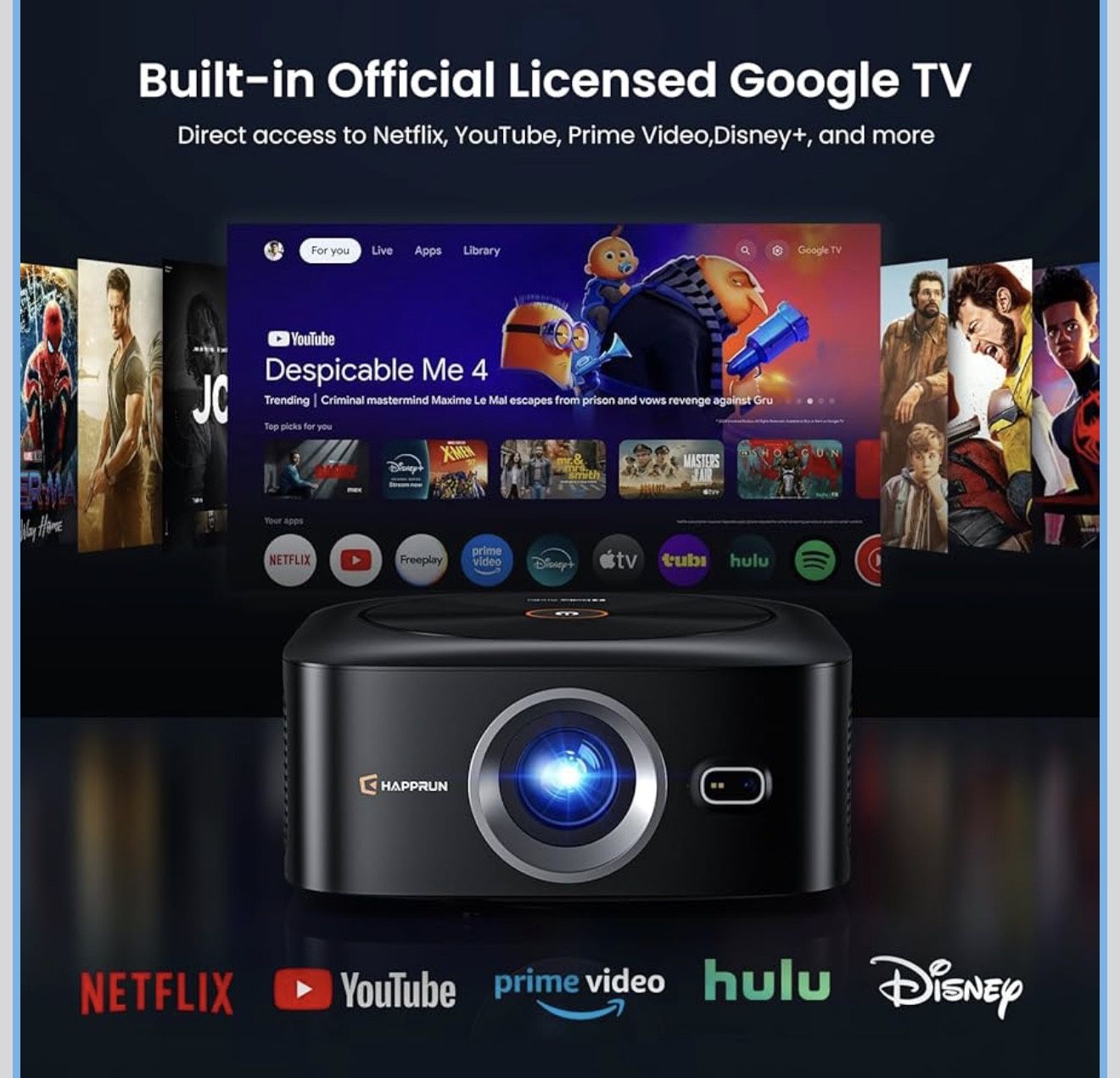 [ Built-in Officially Licensed Google TV ]-Enjoy the reliability of an officially certified Google TV projector. Stream Netflix, Prime Video, YouTube, Hulu, and 10,000+ popular shows and movies—no extra TV stick or box required. Unlike generic projectors, our licensed Google TV system delivers automatic updates, smooth performance, and secure access to your favorite apps. [ Google Voice Assistant ] -Control your 4K projector with just your voice. Simply press the mic button on the remote and say what you need—whether it’s launching Netflix, adjusting the volume, or finding your favorite movie. It makes your movie nights smarter and easier than ever. [Visionary Picture Quality]-Bring the cinema home with stunning clarity and brightness. This native 1080P projector with 1500 ANSI lumens delivers sharp, detailed images that pop with depth. Featuring a premium triple-layer lens for vibrant colors and rich contrast, plus advanced image processing for smooth, crisp playback, it transforms any room into an immersive home theater with lifelike 4K big-screen visuals [3s Auto Focus & Auto Keystone]-Experience effortless projection with our 4K smart projector. Equipped with a powerful processor and intelligent sensors, it instantly adjusts focus and alignment for sharp, vivid images—even on angled walls or tricky surfaces. Forget manual setup—just power on and enjoy crystal-clear viewing anywhere, from cozy movie nights at home to outdoor screenings under the stars. [Dolby Audio & Hi-Fi Speakers]-Enjoy cinematic sound at home or outdoors with Dolby-certified audio. The HAPPRUN movie projector comes with Hi-Fi dual speakers and precision-tuned diaphragms that deliver deep, powerful bass and crisp, balanced treble. Bring cinema-quality sound to your backyard, camping trips, or family movie nights. [Lag-Free Mirroring]-Enjoy seamless projection with advanced WiFi 6 technology that delivers ultra-low latency. Experience effortlessly smooth screen mirroring from iOS, Android, and Windows devices—all without the clutter of cables. This wireless WiFi projector is the ideal centerpiece for your home entertainment. [ 5.2 Bluetooth Technology ] - Wirelessly connect the bluetooth projector to a premium sound system for enhanced audio quality, or stream to Bluetooth headphones for a private theater experience without disturbing others. [Extra Large 200-inch Screen] – Transform any wall into your private theater with display sizes ranging from 40 to 200 inches. Whether you prefer 4:3 or 16:9 aspect ratios, the built-in 50%–100% zoom function makes it easy to adjust screen size without losing clarity. From family movie nights to outdoor parties, enjoy sharp, vivid, and richly detailed visuals on a breathtaking 200-inch screen. [Multi-Device Compatible Projector]-Featuring HDMI, USB, and a 3.5mm audio jack, the HAPPRUN projector seamlessly connects to your phone, laptop, PC, TV stick, PS5, Switch, and more. Enjoy movies, gaming, meetings, or parties with one versatile device. [Adaptable Installation for Any Space ]- HAPPRUN tv projector features a compact design with flexible installation options—desktop, tripod, wall, or ceiling, meeting different projection needs.