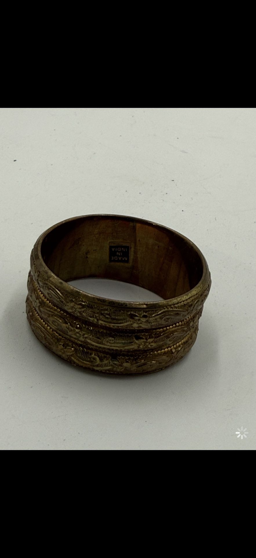 Vintage wide bangle bracelet made of brass with ornate etched detailing. Marked “Made in India” inside. Solid, heavy feel with aged patina. Ethnic boho style, perfect as a statement accessory or vintage collectible. Normal wear consistent with age.