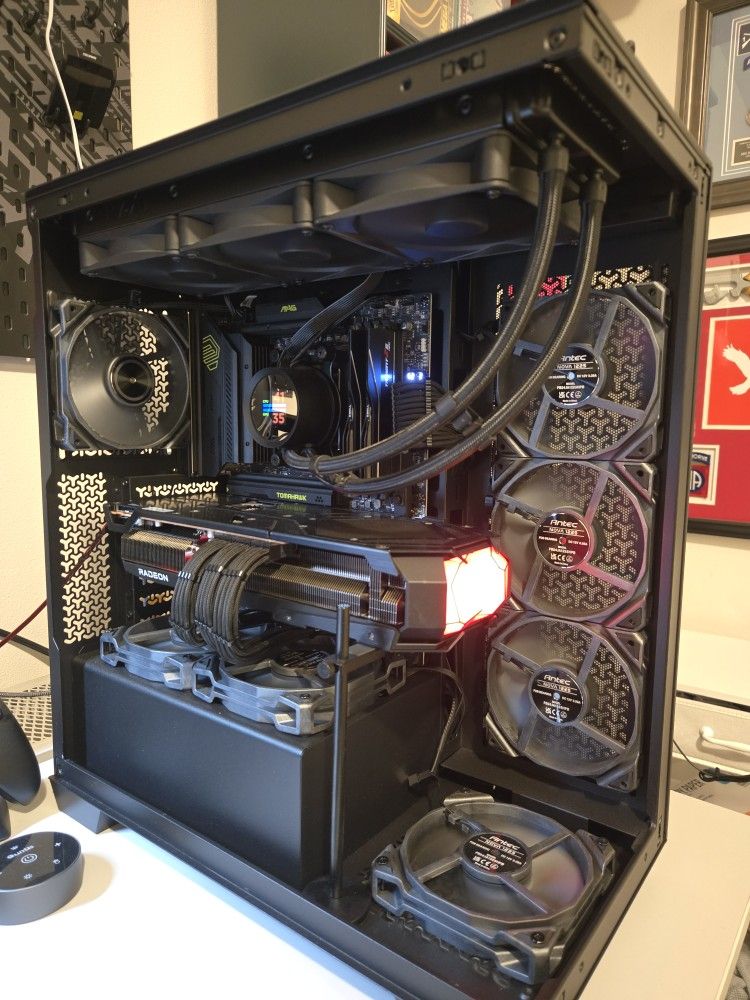 Custom PC. Built 4 months ago. Price is based on pcpartbuilder. Nothing wrong, just looking to build another. No RGB besides the GPU. No hold/trades/offers. Can show that it works if you can get on base. Otherwise if the ad is up, its available. Ryzen 9 9950X3D 16-Core Processor PowerColor Red Devil AMD Radeon RX 9070 XT 16G GDDR6 MAG X870E Tomahawk Wifi NZXT Kraken 360mm ( RL-KN360-B1) G.SKILL Trident Z5 Neo Series (AMD EXPO) DDR 5 32G 6000MT/s (CL30) 2x M.2 SSD 500G, 1TB Corsair 3500X Mid-Tower ATX (Black) 7x 120mm Antec NOVA 1225 PWM Corsair 1000W Gold