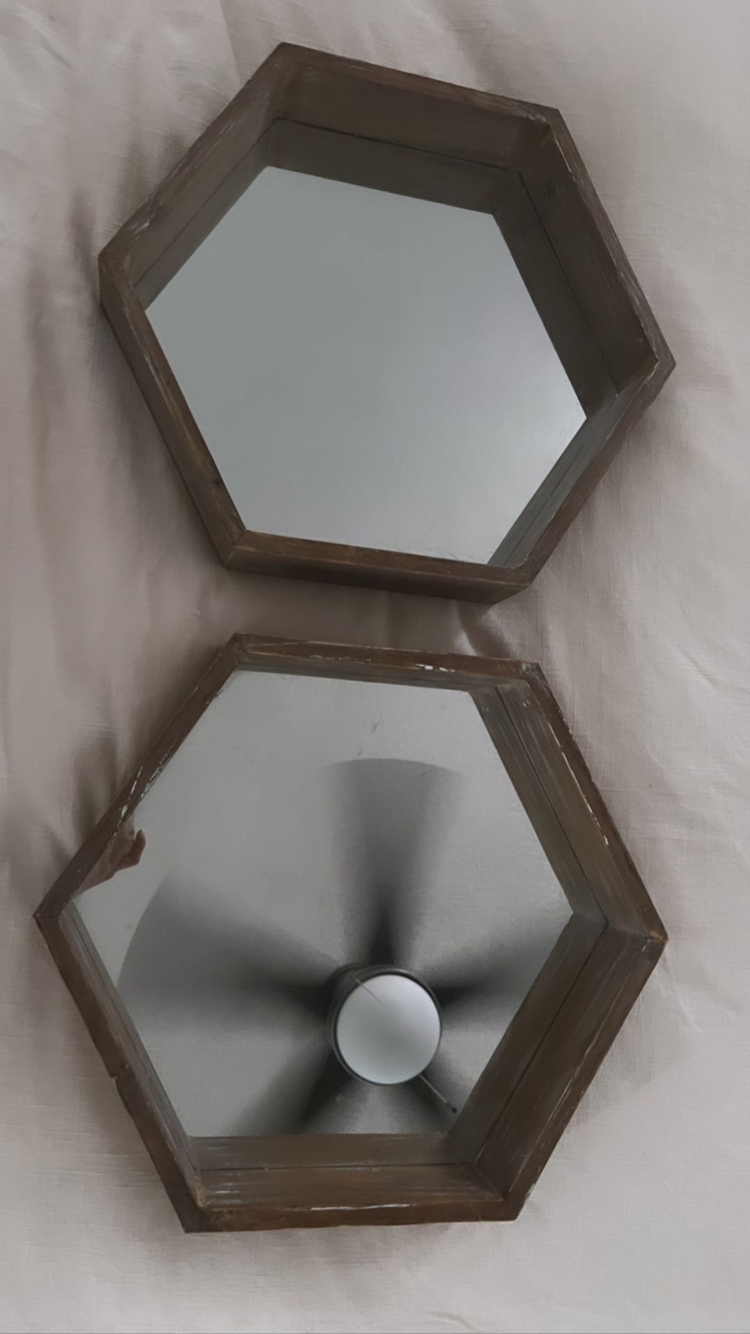2 hexagon mirrors, wall decor wood they have room to add plants like a little shelf. Super cute, paid $70 for the pair asking $30 for the pair