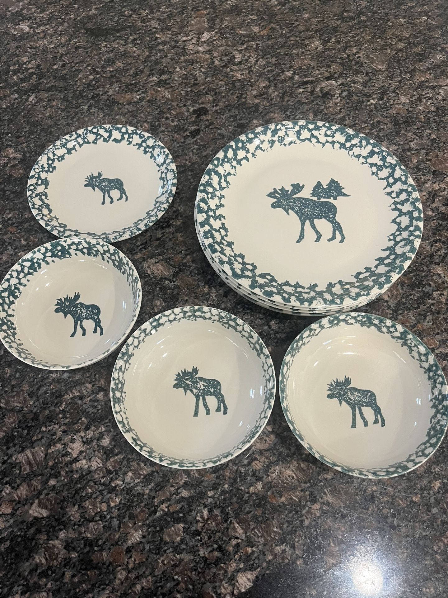 Tienshan Folk Craft MOOSE COUNTRY 10.25" Dinner Plates Spongeware Green 5 Plates Plus Extra This is a set of 5 dinner plates, 1 side plate, and 3 bowls. Selling as a set but will split up for market price. All of them are in excellent shape, no chips or cracks. Thanks for looking!