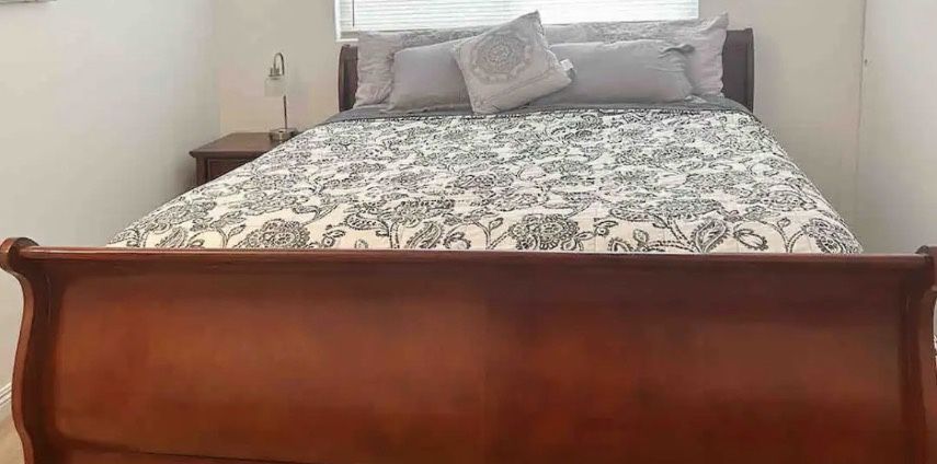 Hello this brown bed frame is wood and fits a queen size put together once and taken down nothing broken