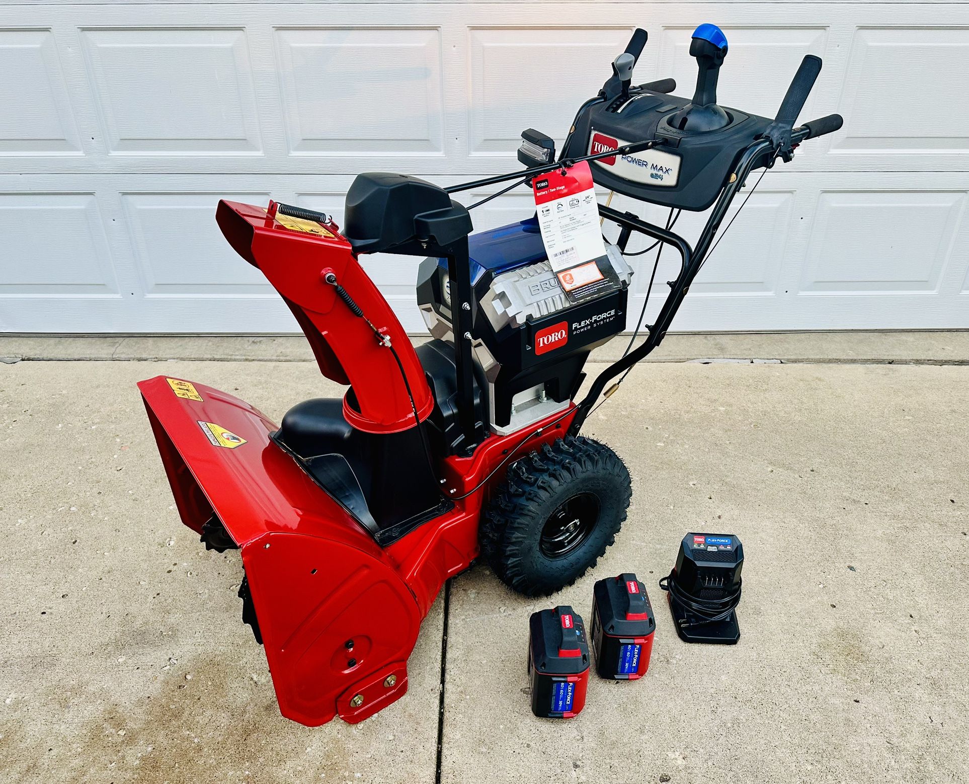For consideration is our Toro Power Max E24 2 stage 60v snowblower. Model 39924. Works great and only used 3 times. 24” clearing path. Comes with two 6.0ah batteries and 1 battery charger. Any questions please let me know. Thanks