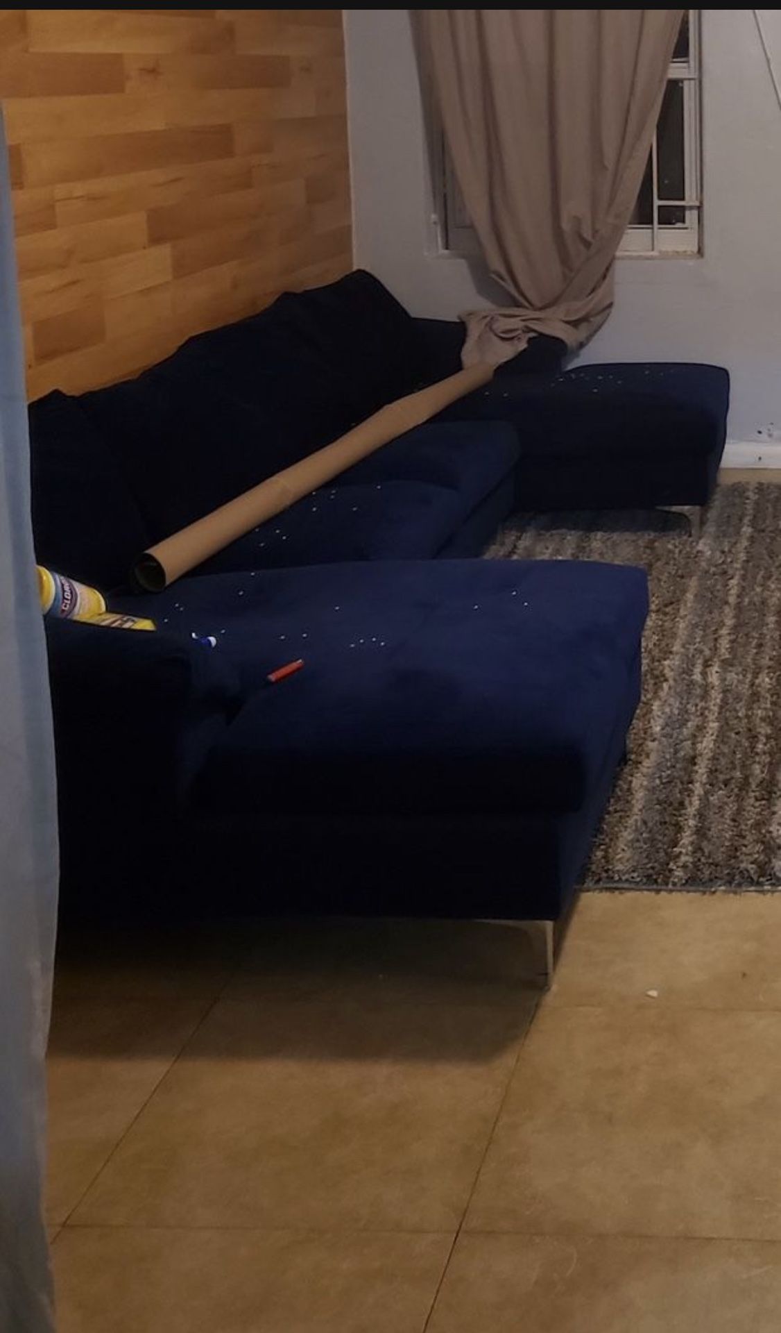 Cushion zipper broken, two little stains and right side arm rest small burn