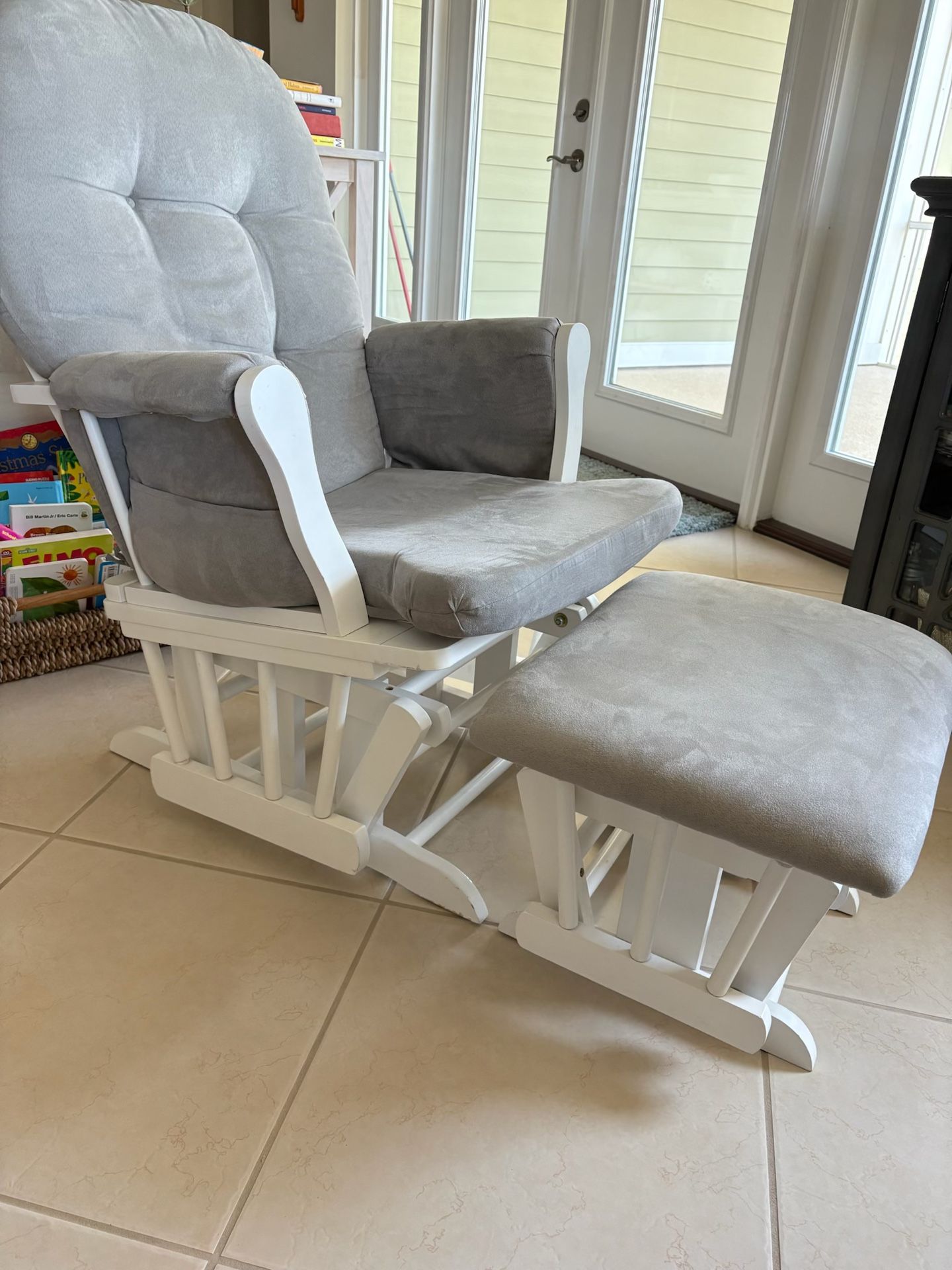 White wood frame with grey velour fabric. Great condition. Barely used.