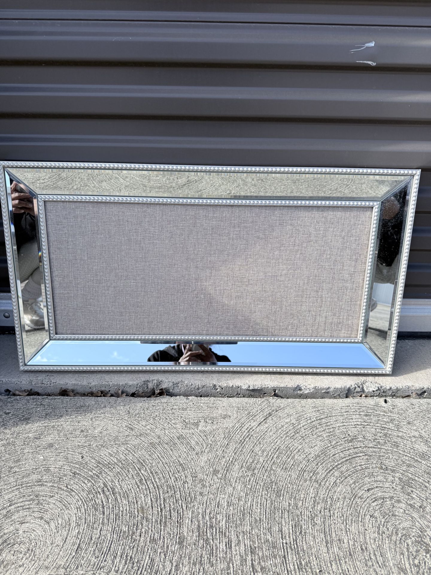 Beautiful decorative wall accent featuring: • Mirrored outer frame • Nailhead trim detail • Neutral textured fabric center • Horizontal design • Ready to hang • Great condition Perfect for: • Above a bed • Over a sofa • Entryway • Dining room • Glam, transitional, or modern décor Adds light and dimension to any space. Located in Concord.