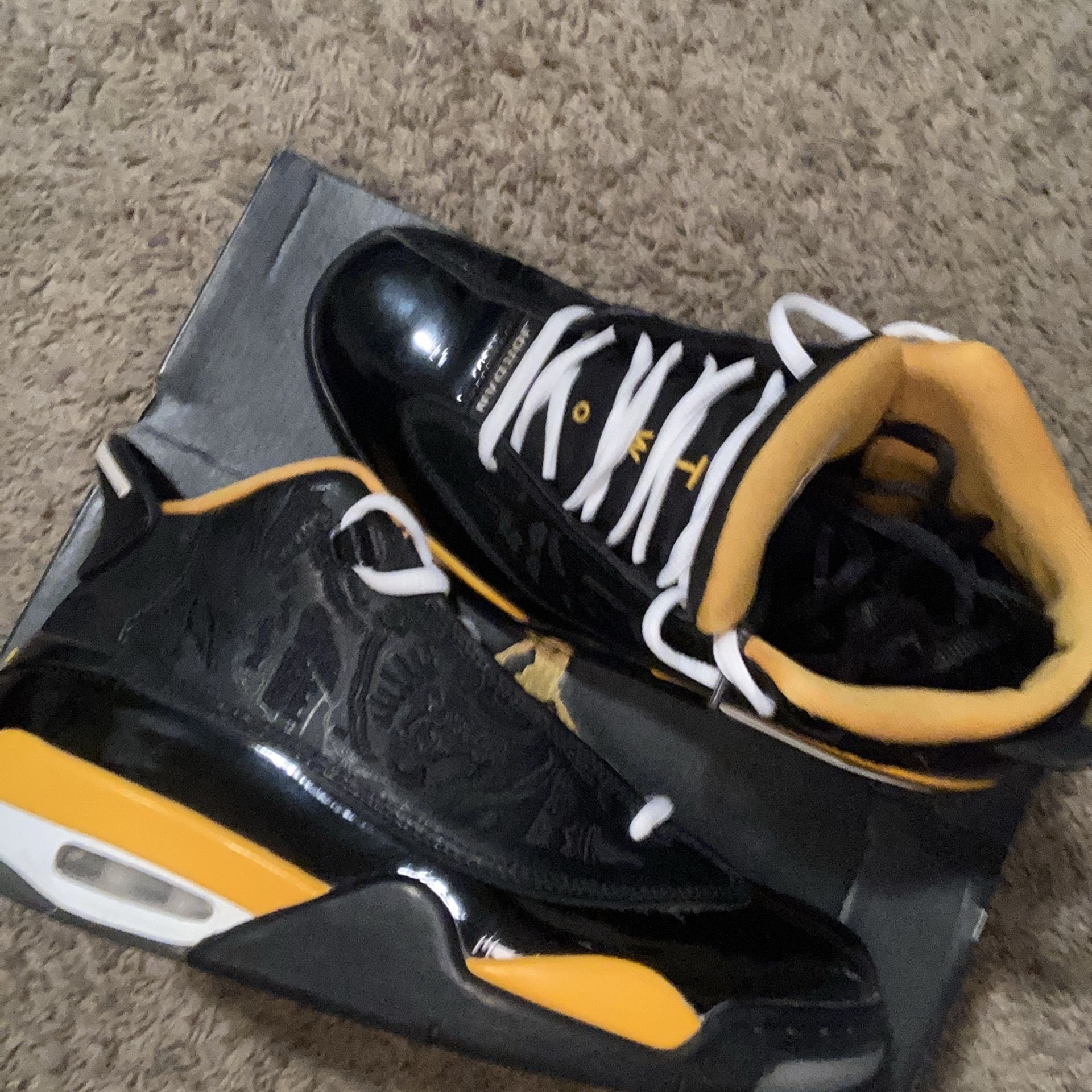 These shoes are the air Jordan dub zero (GS) black/taxi-white noir/blanic/taxi great condition worn 6 times comes with actual shoebox and another pair of black laces