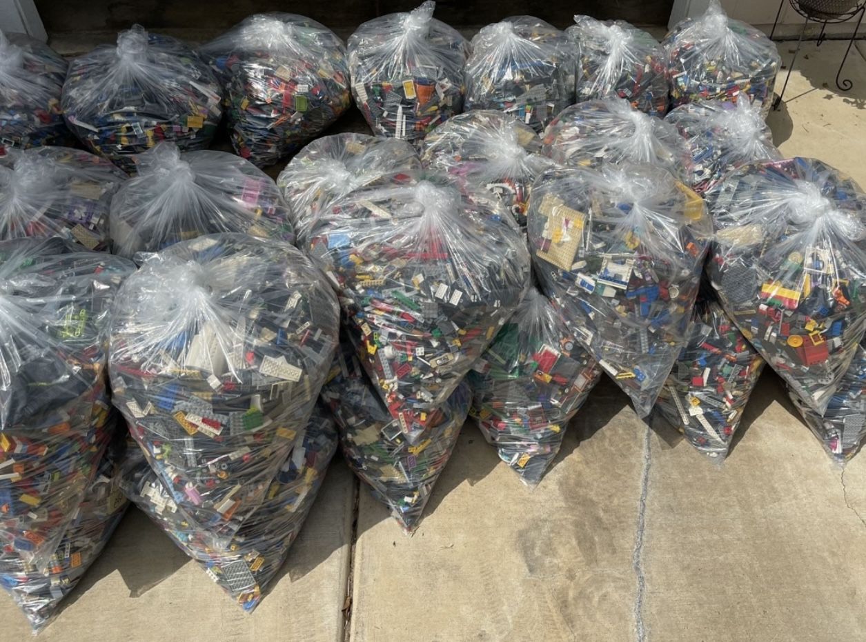 Lego big bag of 10 pounds. All lego brand and great for kids to play for hours and build. Pick up in Menifee or Murrieta. Dont pay high price for a lego set with only less than 1 pound?? You get 10 pounds for 65.00. These are random mixed lots. You do not get all bags in pictures . No Minifigures included just good clean Bulk Lego 2 bags $120