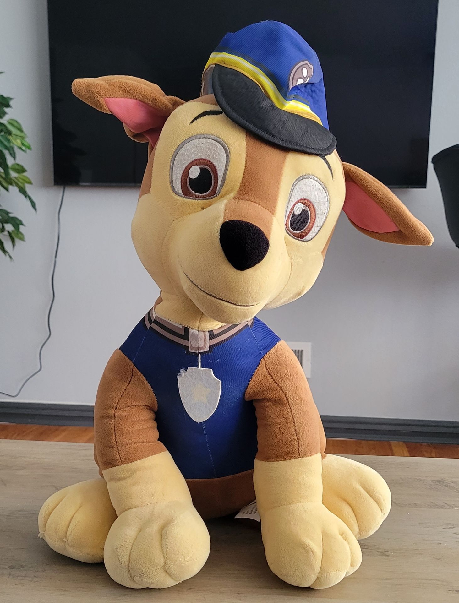 This is a large plush toy of the character Chase from the PAW Patrol series featuring his classic police uniform.