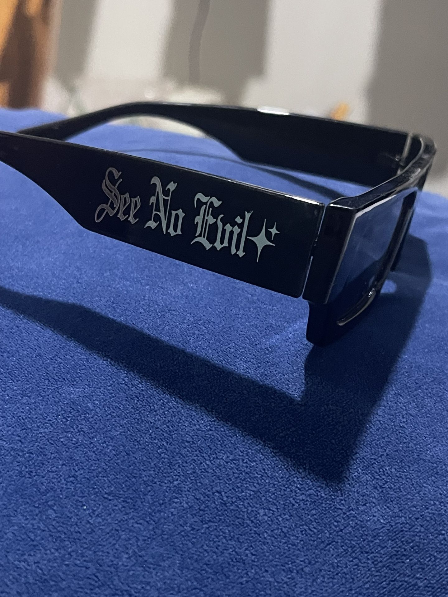 Blacked out sunglasses. “See no evil” on both sides