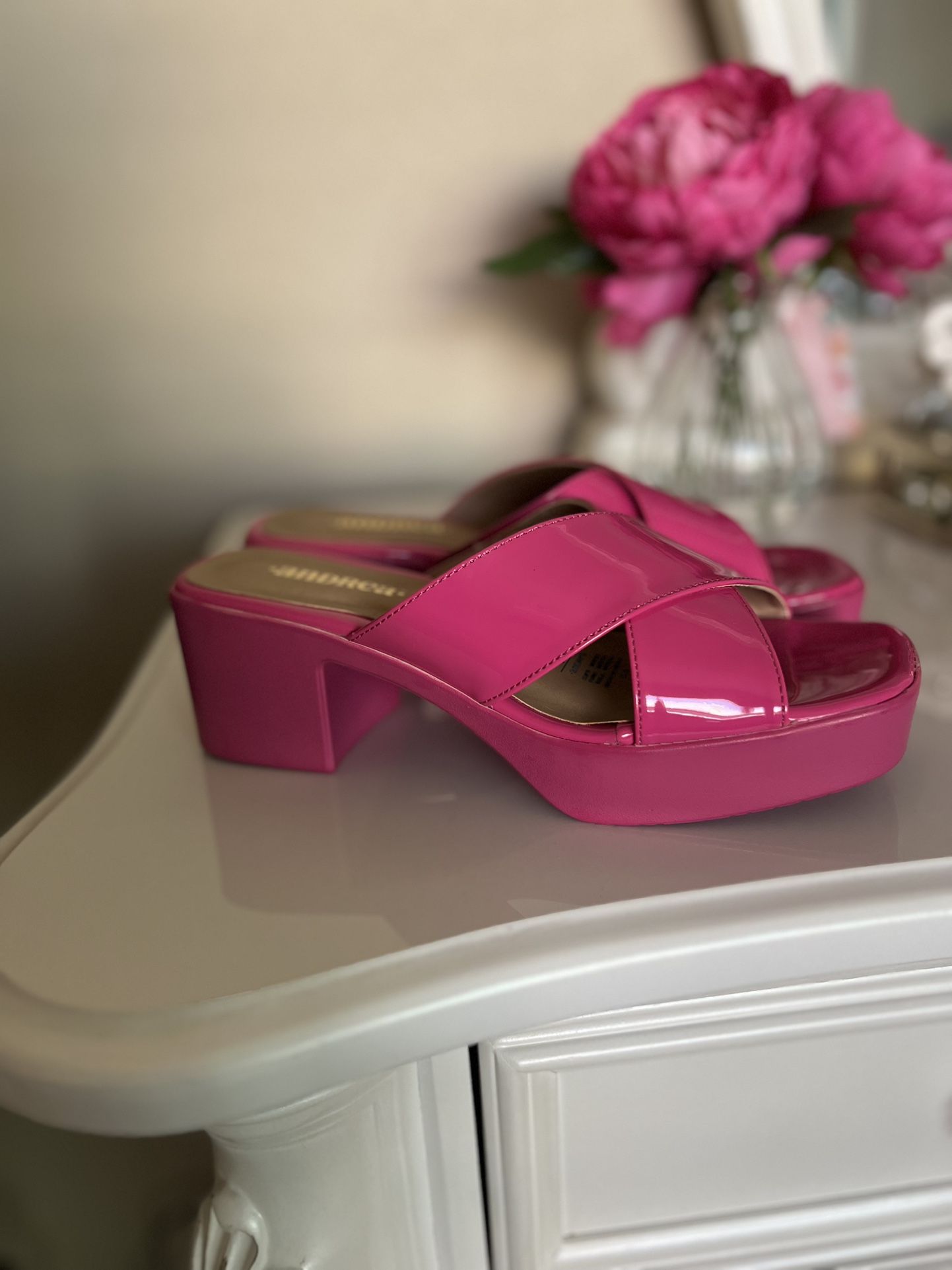 Hot pink platform mule heels with a chunky block heel and glossy patent finish. Features a stylish cross-strap design and an easy slip-on style.