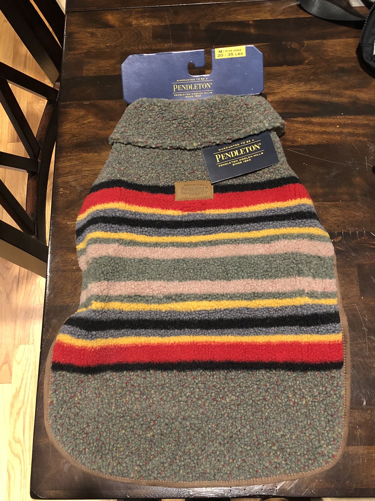 Brand new, still in packaging Pendleton Yakima Camp Dog Coat. Size medium. Fits dogs up to 35 lbs, see picture and/or manufacturer website for further sizing info. Fantastic craftsmanship that Pendleton is well known for and very stylish too! I really wish my dog liked wearing jackets but he refuses no matter what we do. Retail of $65 plus tax, asking $45. Local pickup preferred From the manufacturer: “A favorite camp blanket design translated into a plush coat for for your furry best friend. Knitted Berber fleece reverses to quilted faux suede. Hook and loop closures. Polyester Machine wash Imported” Keywords: dog coat, dog jacket, dog sweater, Pendleton, Pendleton jacket, Pendleton coat, Pendleton sweater,