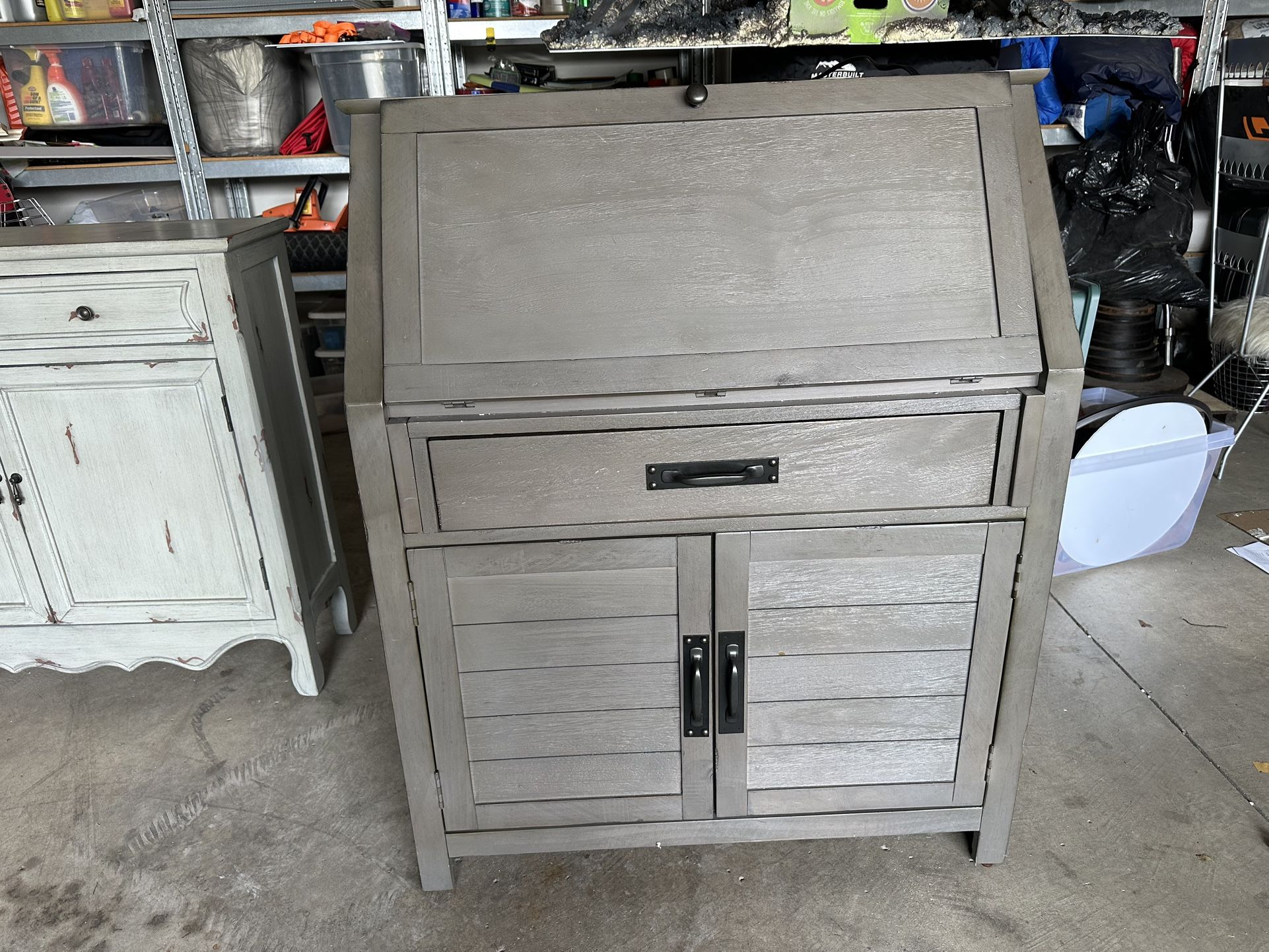 Fold down desktop with plugs and USB port with easy access. Storage underneath. 29.5” d X 43.75” h X 23.75” w