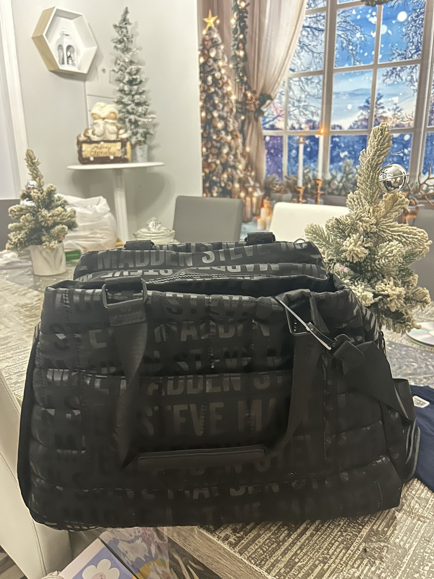 A new black Steve madden duffle bag. Perfect condition. Medium size. 6 pockets total inside and out. Holds lots of space. :)
