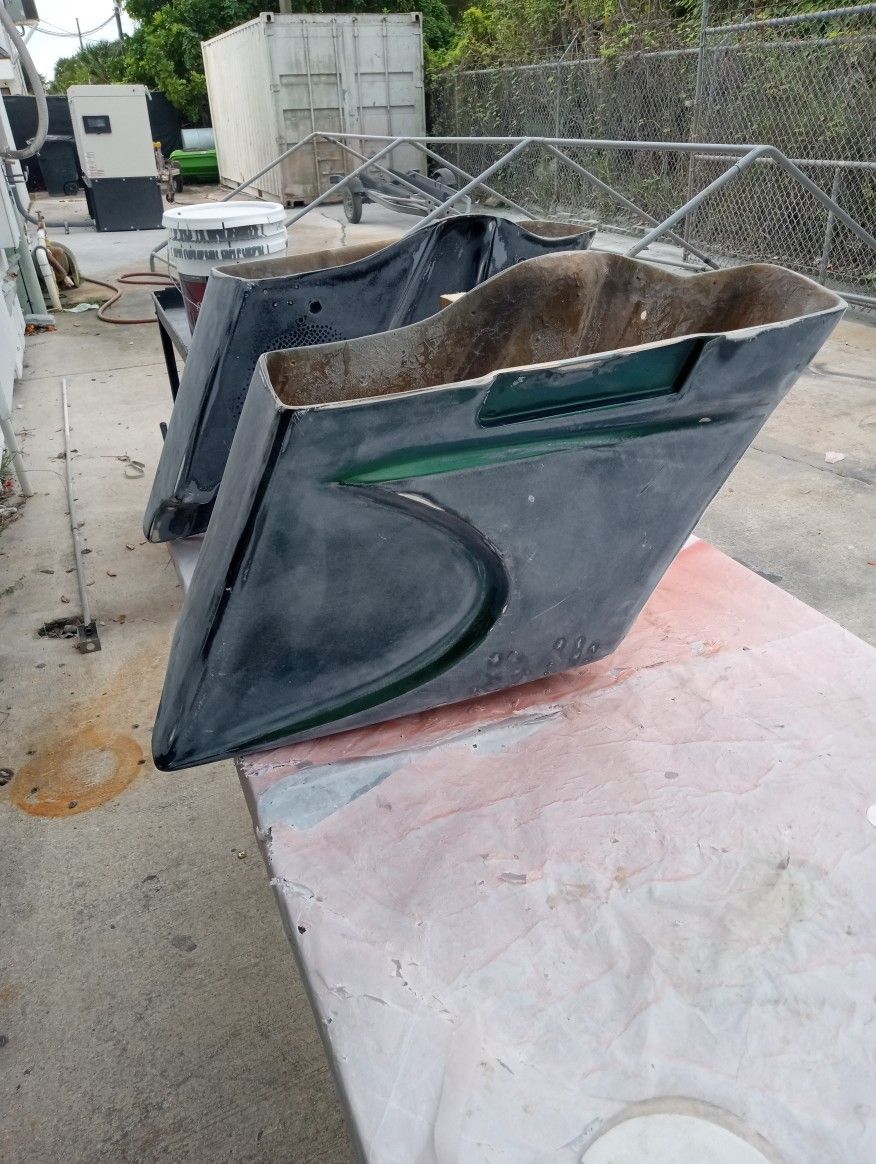 These fiberglass bags are used but in good condition These bags have a nice scallop on the side of the bag to give your bike a custom look Just needs to be repainted