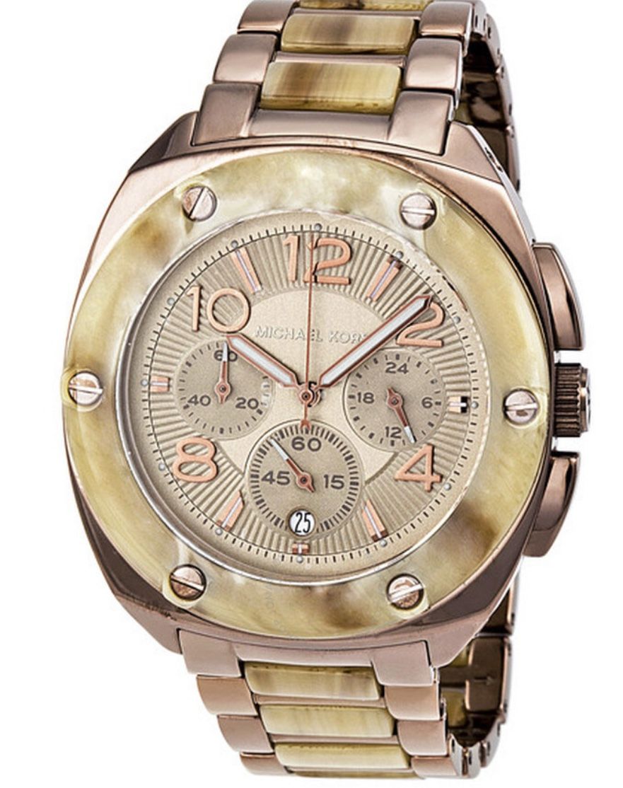 Pre owned watch Great working condition Comes with extra links Espresso ion-plated stainless steel case with a espresso ion-plated stainless steel and horn resin bracelet. Fixed horn resin bezel. Espresso dial with luminous brown hands and alternating Arabic numeral and index hour markers. Minute markers around the outer rim. Dial Type: Analog. Luminescent hands and markers. Date display at the 6 o'clock position. Chronograph - three sub-dials displaying: 60 second, 60 minute and 24 hour. Quartz movement. Scratch resistant mineral crystal. Pull / push crown. Solid case back. Case diameter: 43 mm. Case thickness: 11 mm. Round case shape. Band width: 20 mm. Fold over clasp with safety release. Water resistant at 100 meters