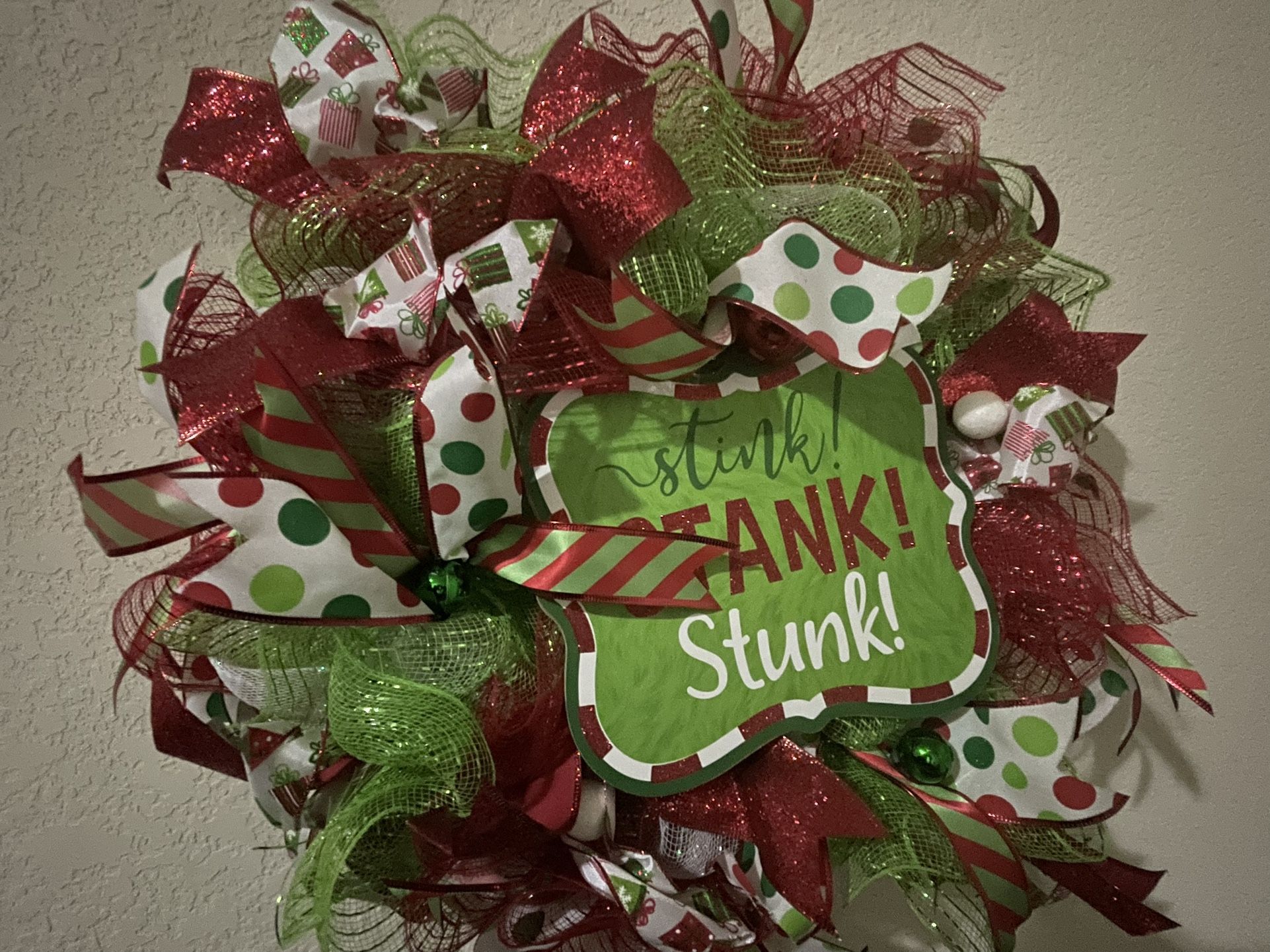 Beautiful, full Grinch-inspired holiday wreath made with high-quality deco mesh and premium ribbon. Features bright Christmas colors, glitter ribbons, polka dots, striped bows, ornaments, and the classic “Stink! Stank! Stunk!” center sign. Perfect for front doors, offices, parties, or anyone who loves fun Christmas décor.