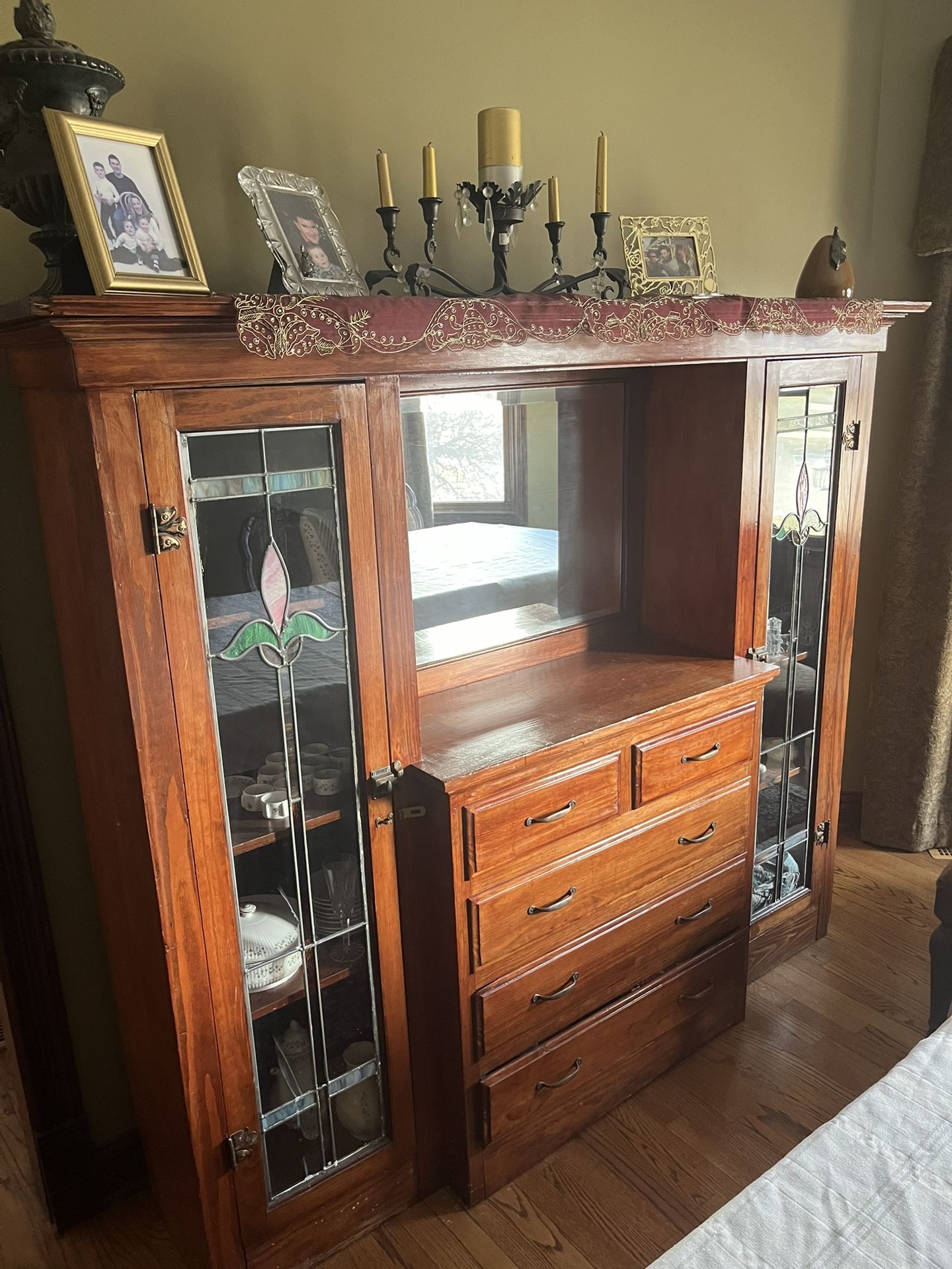 Oak antique, leaded, glass cabinet 72 x 66, 12 1/2 inches deep